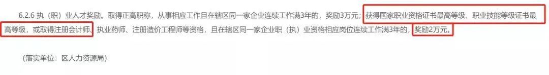 比如在深圳,有注册会计师证、职业药师证等资格,并在同一家公司做与执业资格对应岗位工作满3年,奖励2万。