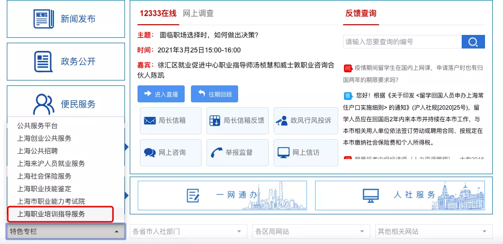 比如想知道能够领取补贴的技能等级证书有哪些,可以去上海人社局官网左下角的「特色栏目」-「上海职业培训指导服务」网站。