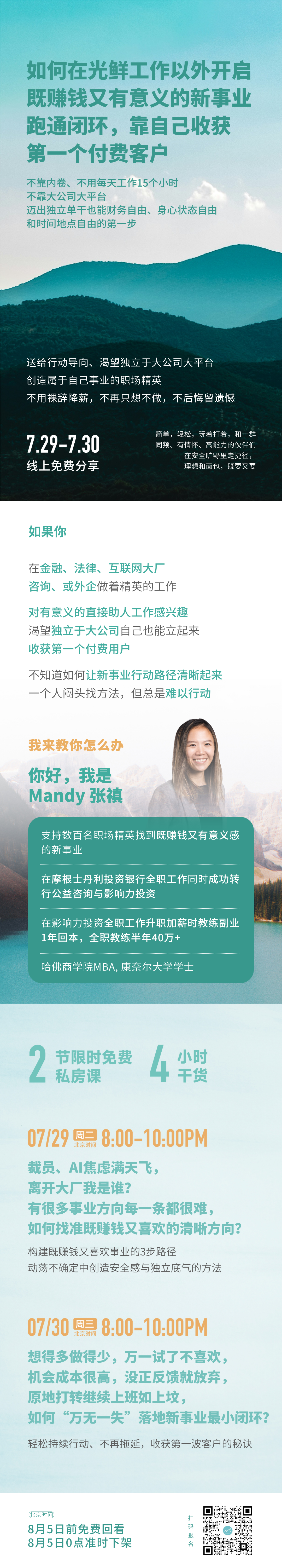 大家好呀!我即将在在7月29日和30日(周二和周三)再次推出升级的免费私房课《如何在光鲜工作以外, 开启既赚钱又有意义的新事业,跑通闭环,靠自己收获第一个付费客户》