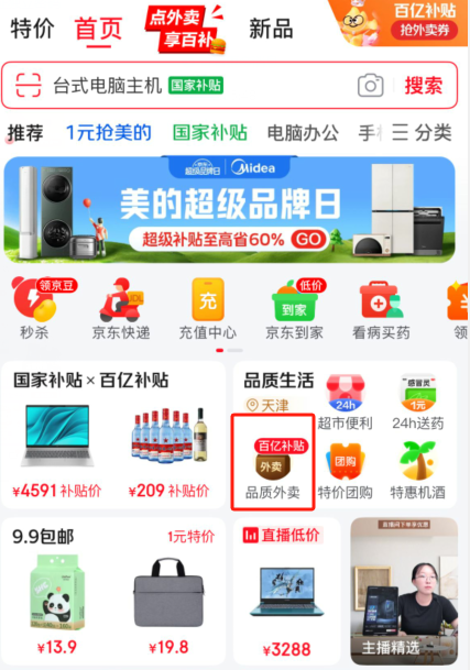 本期节目上线时,京东首页里,外卖不但在显眼的位置,而且加上了“百亿补贴”的标识: