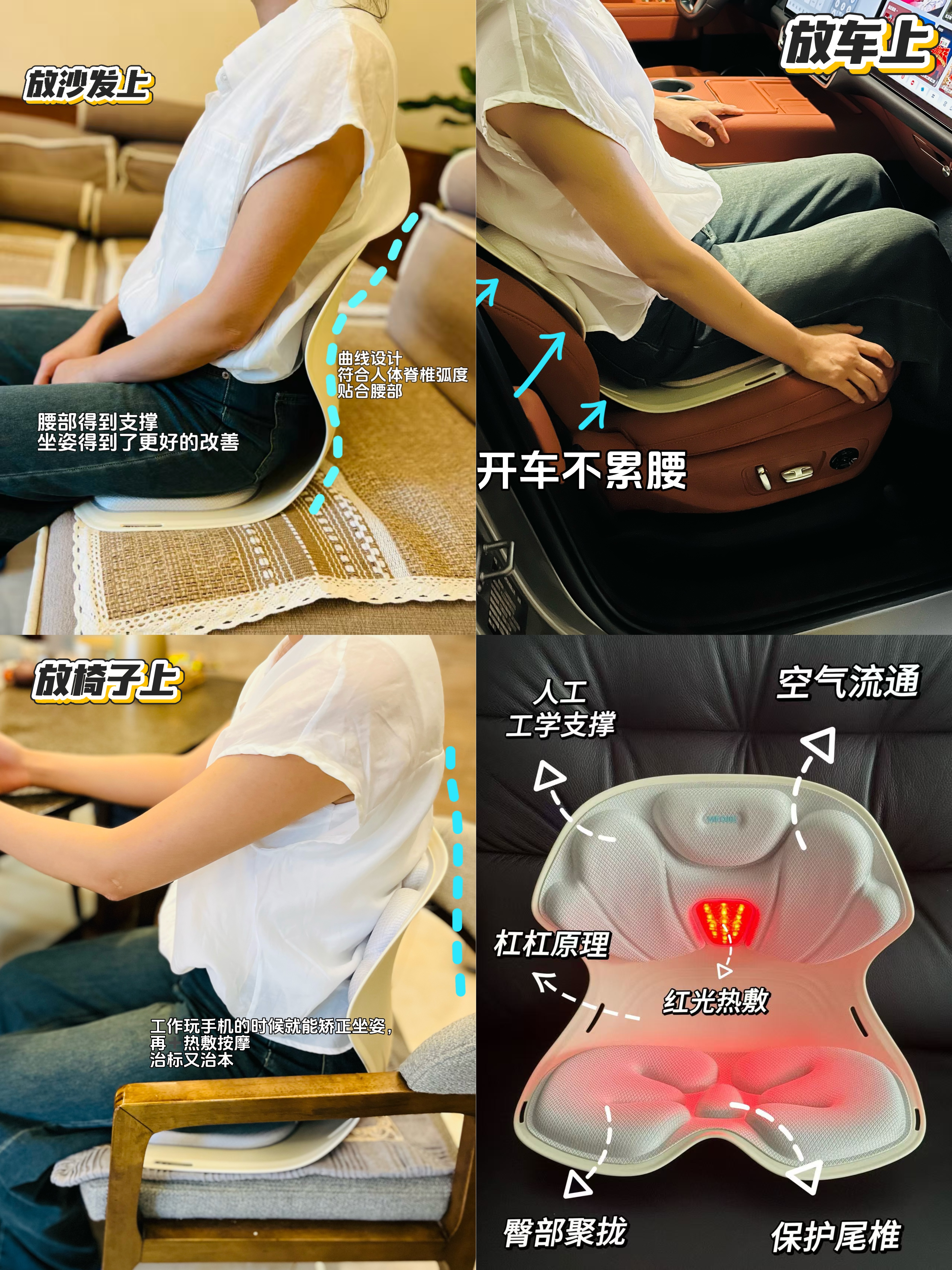 →沙发上、椅子上、地上、工位上、车上,小巧轻便可以放在任意地方随时随地护腰。