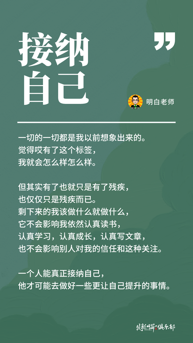 觉得哎有了这个标签,我就会怎么样怎么样。但其实有了也就只是有了残疾,也仅仅只是残疾而已。剩下来的我该做什么就做什么,它不会影响我依然认真读书,认真学习,认真成长,认真写文章,也不会影响别人对我的信任和这种关注。
