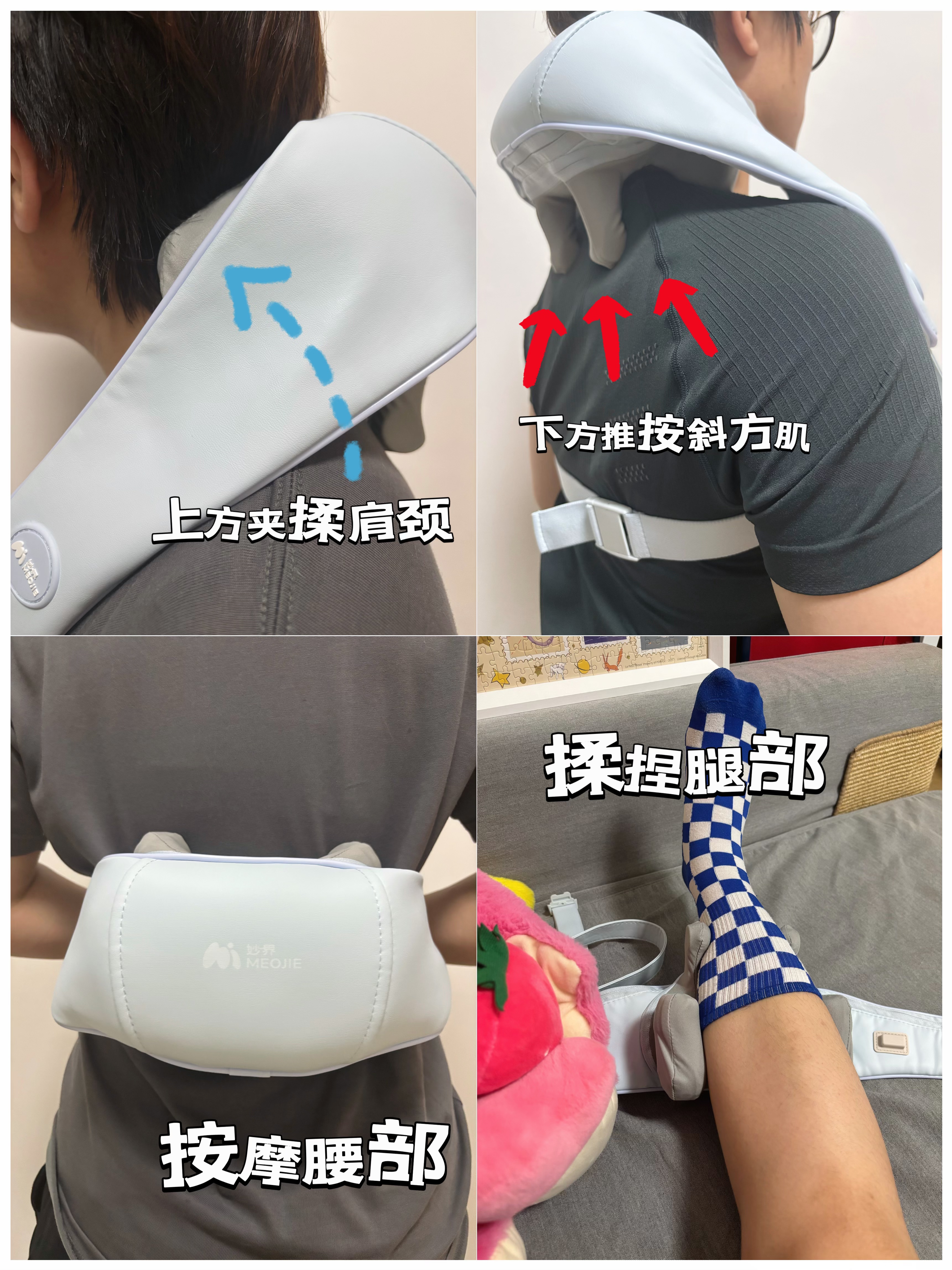 其次是它的穿戴式设计,上班累了或者下班到家玩手机的时候直接往后一扣就好了,它按它的你忙你的,两不耽误。无线设计全身都能用,不仅是平时最容易酸痛的肩颈腰背,像我们平时训练完也可以用它揉捏腿部和手臂,防止乳酸堆积。枕套还是可拆卸清洗的,脏了拆下来洗洗就行,细节满满。