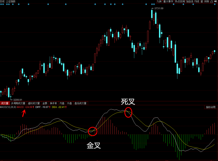 红绿柱的长短就是我们常说的macd值,而macd值的数据就在指标的左上角。图中箭头所指的位置就是macd数据。macd为负数说明出现的是绿色柱子,macd为正数说明出现的是红色柱子。所以当白、黄两条线即将金叉的时候,你需要密切关注macd值的变化,金叉形成之前macd值一定是负数,因为此时的柱子为绿色。当金叉刚好形成之时,macd值会转为正数,此时的绿柱也会完全消失并且出现红柱。所以当macd值刚好由负转正的时候,就是金叉形态完成的第一时间。