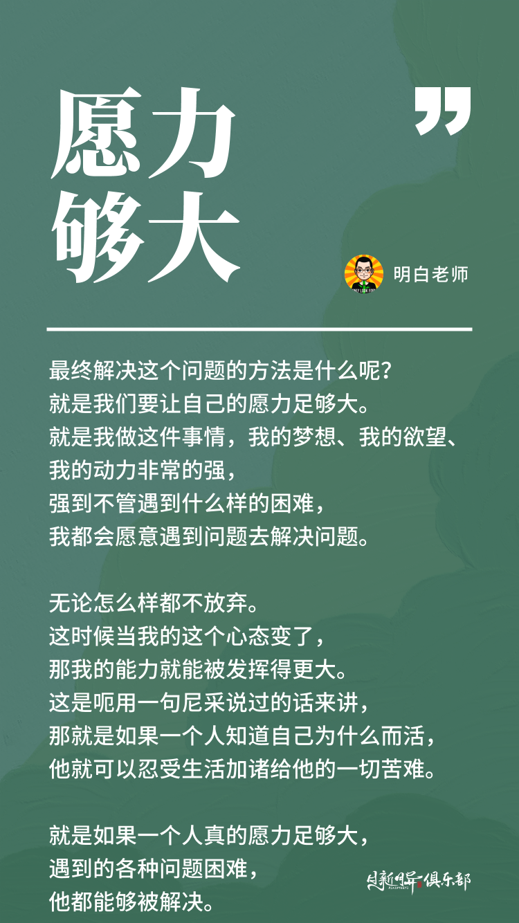 无论怎么样都不放弃。这时候当我的这个心态变了,那我的能力就能被发挥得更大。这是呃用一句尼采说过的话来讲,那就是如果一个人知道自己为什么而活,他就可以忍受生活加诸给他的一切苦难。