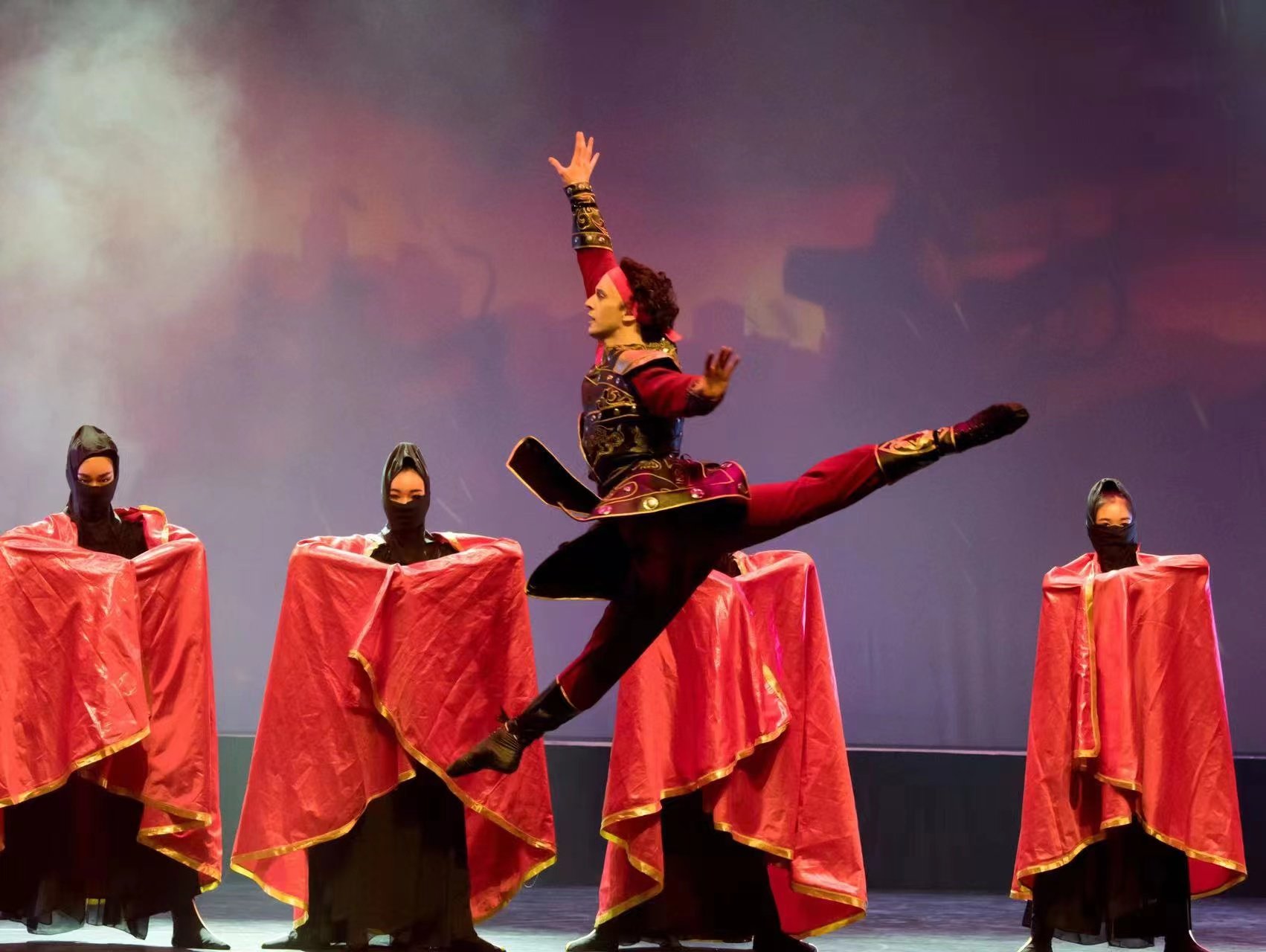 而演员方面,选拔、培训,排练也更是一件难上加难的事。因为加拿大相比中国,本来人就少,职业演员数量也少,专业舞团更少。因此,这剧需要的演员也是多舞种多族裔,不同年龄风格各异的。我们解决办法是,按角色需要,主演特邀著名演员、舞团首席、新秀领衔;角色演员和现代舞友等都是通过audition招募遴选,而主要舞段木兰军剑舞,披风舞等则由我们Lindance训练有素的青年精英舞团担任,她们能力强,能作战。剧中武术部分,我们与著名武术学校合作,选武术冠军加盟,共同完成。但这100多位不同级别不同风格不同舞种不同年龄的演员,同台共演近一个半小时,加序和尾声共6幕28个舞段的原创舞剧,我们培训、排练的难度和挑战可想而知的。