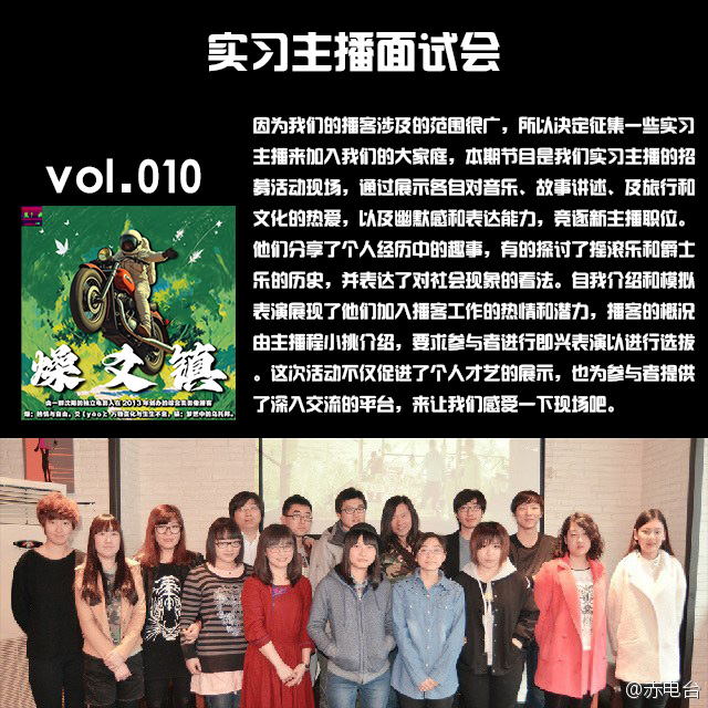 因为我们的播客涉及的范围很广,所以决定征集一些实习主播来加入我们的大家庭,本期节目是我们实习主播的招募活动现场,通过展示各自对音乐、故事讲述、及旅行和文化的热爱,以及幽默感和表达能力,竞逐新主播职位。他们分享了个人经历中的趣事,有的探讨了摇滚乐和爵士乐的历史,并表达了对社会现象的看法。自我介绍和模拟表演展现了他们加入播客工作的热情和潜力,播客的概况由主播程小挑介绍,要求参与者进行即兴表演以进行选拔。这次活动不仅促进了个人才艺的展示,也为参与者提供了深入交流的平台,来让我们感受一下现场吧。