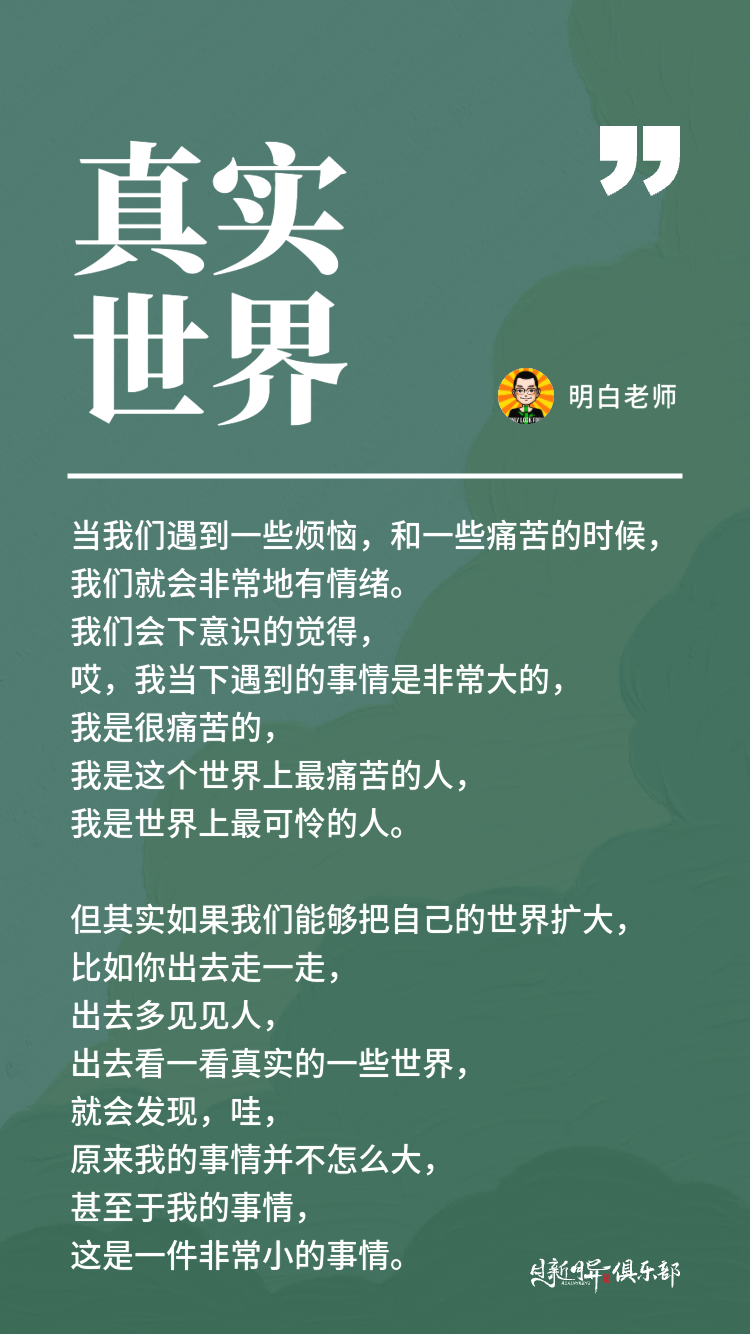 但其实如果我们能够把自己的世界扩大,比如你出去走一走,出去多见见人,出去看一看真实的一些世界,就会发现,哇,原来我的事情并不怎么大,甚至于我的事情,这是一件非常小的事情。