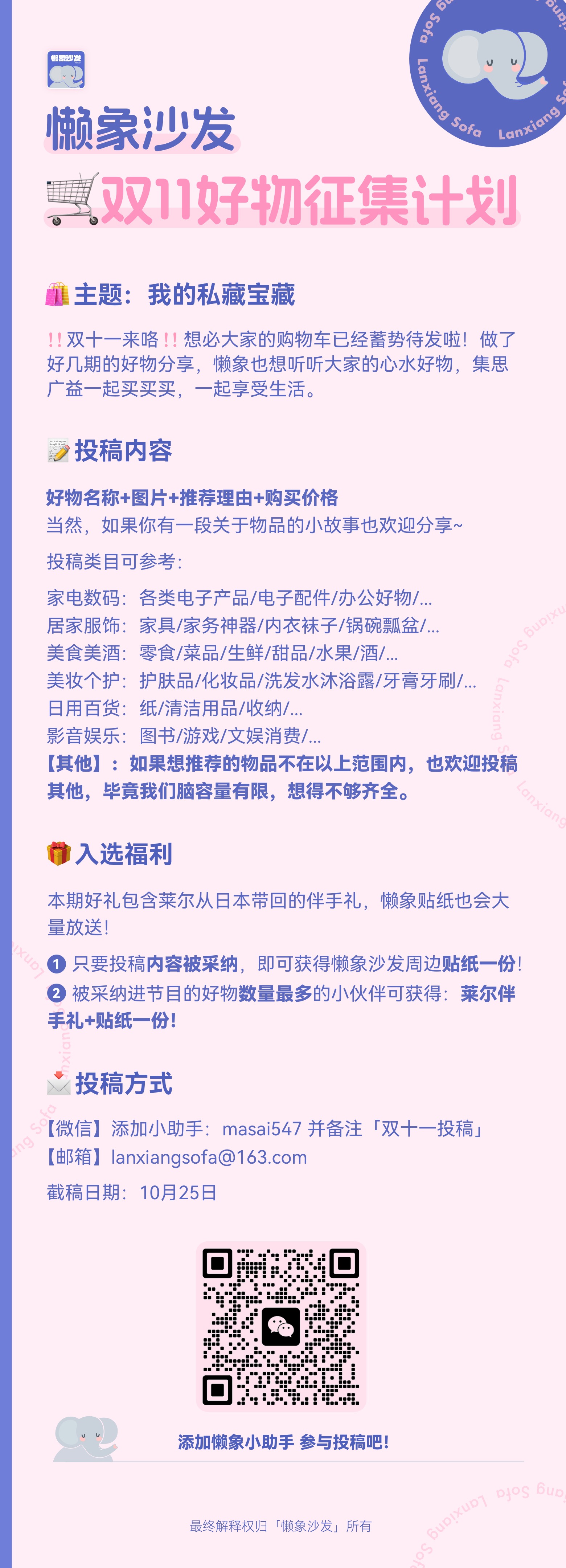 比起我们自己分享,懒象更想听听大家的心水好物,让我们集思广益,在接下来的双11双12里,一起买买买,一起享受生活!超级期待各位的推荐和安利,记得来玩噢~