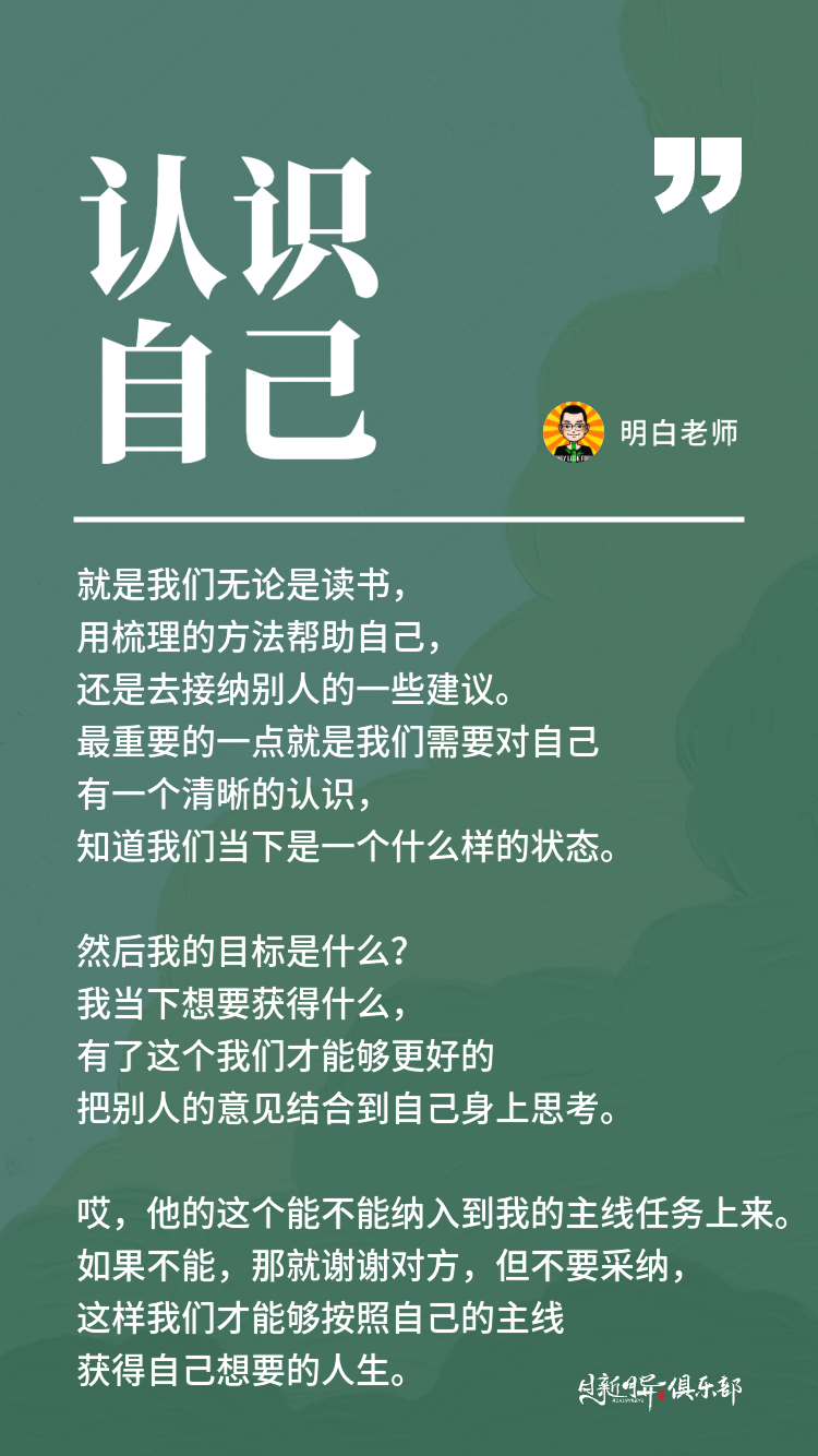 所以刚才的建议有一个核心点,就是我们要每天花时间思考自己,我是一个什么样的人,我想要过什么样的生活?我的目标是什么?有了这个才能够更好的去把外界为我所用,让世界成为我的参考答案,能够帮助我变得更好。