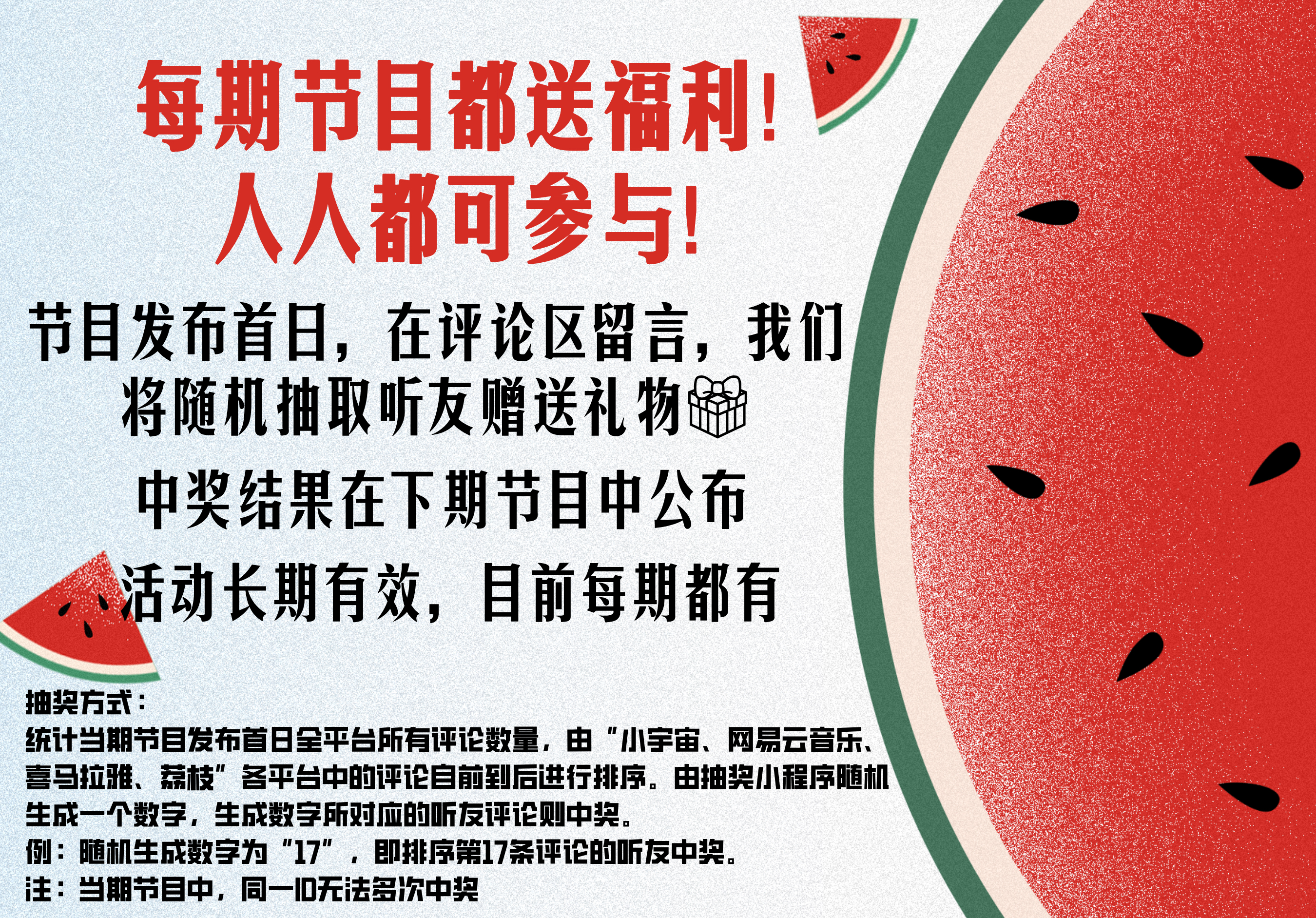 在节目发布当天,在评论区评论留言即可。我们会在评论中随机抽取赠送(与评论内容、字数无关,真随机抽取),中奖结果在下期节目公布。