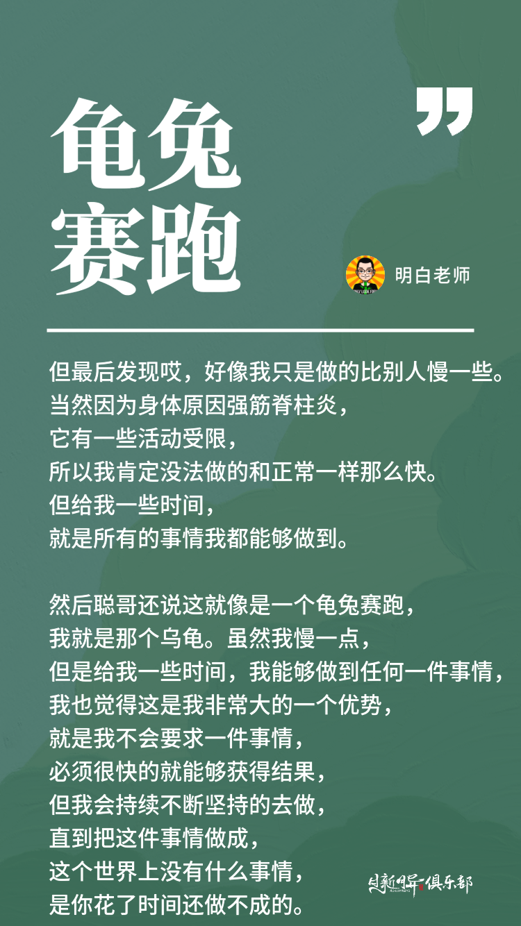 然后聪哥还说这就像是一个龟兔赛跑,我就是那个乌龟。虽然我慢一点,但是给我一些时间,我能够做到任何一件事情,我也觉得这是我非常大的一个优势,就是我不会要求一件事情,必须很快的就能够获得结果,但我会持续不断坚持的去做,直到把这件事情做成,这个世界上没有什么事情,是你花了时间还做不成的,也是想要分享给各位的一个思考。