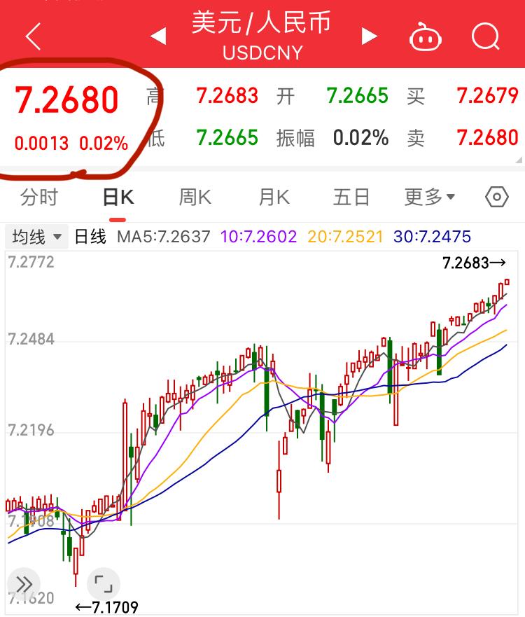 汇率和股价一样是时刻波动的,当你看到7.26变成7.3的时候,请问这意味着什么?意味着美元升值、人民币贬值。美元始终是固定的“1”,之前1美元能换7.26元,而现在能换7.3元,同样的美元能换更多的人民币,说明美元的价值变高、也就是升值了,而对应的人民币则是贬值。