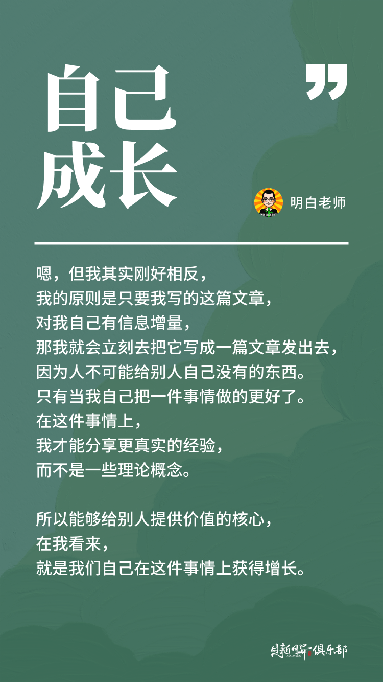 所以能够给别人提供价值的核心,在我看来,就是我们自己在这件事情上获得增长。那把注意力关注到自己的成长上,输出输出自己的成长,就是一件非常重要。甚至最重要,唯一重要的事情。当我们能够把注意力放在自己的成长上,每篇文章都输出自己的成长。那我们就一定能够慢慢的对别人的分享更有价值。