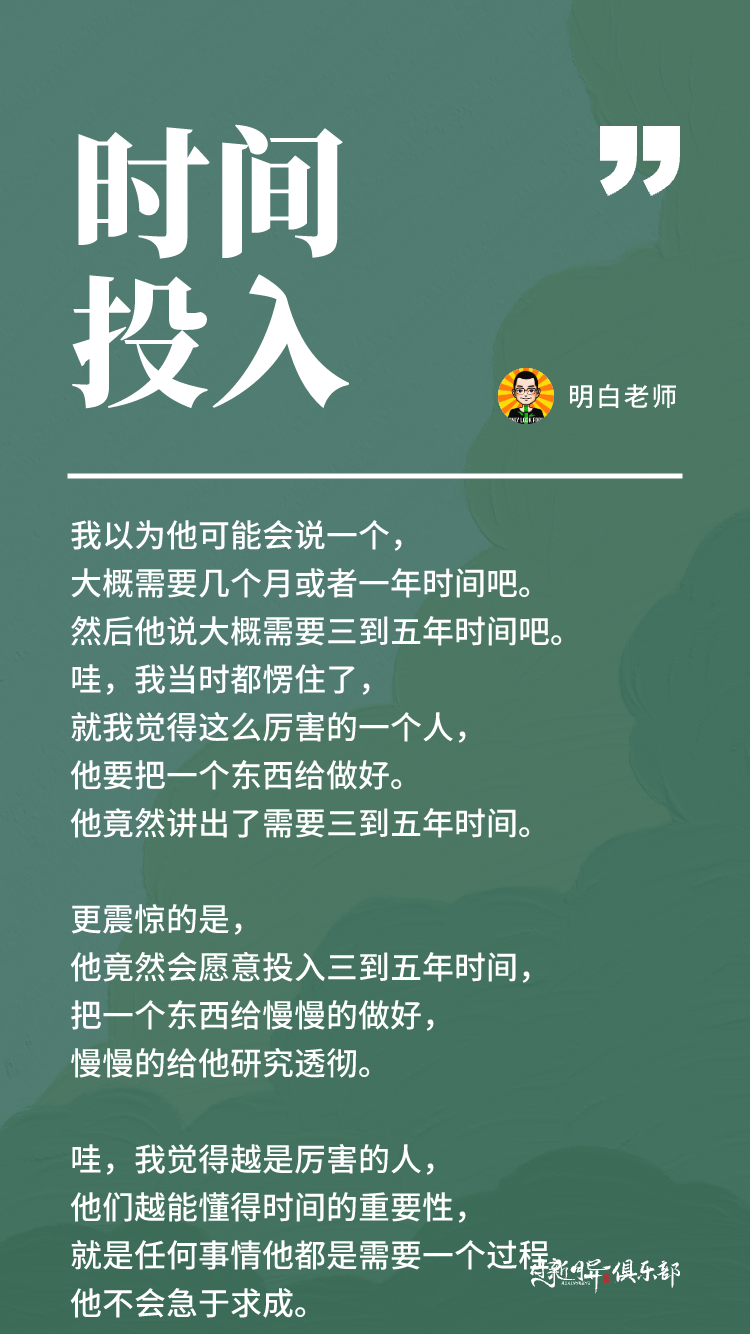 哇,我觉得越是厉害的人,他们越能懂得时间的重要性,就是任何事情他都是需要一个过程,他不会急于求成说,哎,我可能一周一个月、两个月、三个月我就要把这件事情做好。