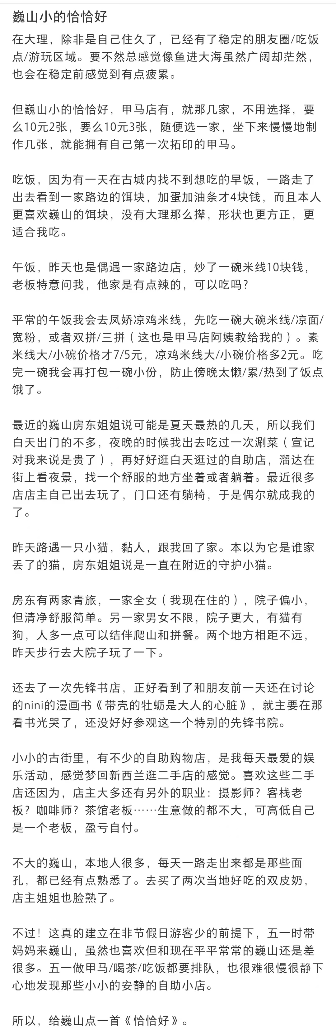 未听先评 巍山古城真的很有烟火气 比起大理的商业和游客氛围 这个地方小而美 几块钱就能在茶馆呆一下午 喝茶 嗑瓜子 发呆。其中一天去爬了巍山 山上植被很多 视野很好 一路上有各种各样的道观 非常神奇之旅