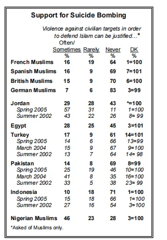 “认为为了捍卫伊斯兰而对平民实施恐怖主义是可以被正当化的这种观念,虽然比此前的调查有所减少,但仍然有相当数量的支持者……即便在欧洲的穆斯林少数群体中,法国、西班牙和英国大约有七分之一的人认为,为了保卫伊斯兰免受其敌人的侵害,对平民实施自杀式炸弹袭击在某些情况下至少是可以被正当化的。”