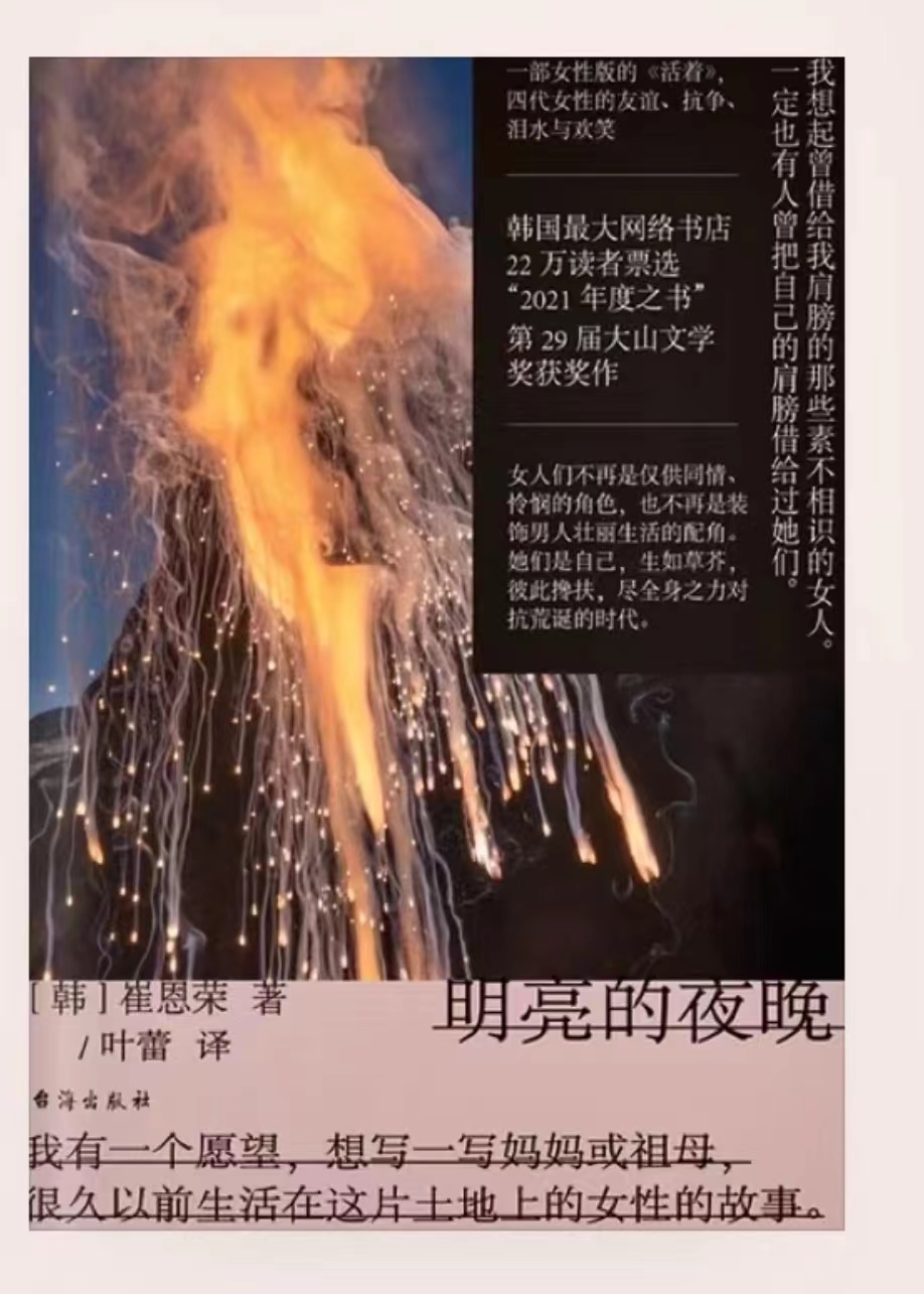 今年年初的时候我看了崔恩荣的《明亮的夜晚》,这是我第一次看韩国作家的作品。这本书描绘了四代女性互相扶持、相互救赎的故事,女人们不再是仅供同情、怜悯的角色,也不再是装饰男人壮丽生活的配角。她们是自己,生如草芥,彼此搀扶,尽全身之力对抗荒诞的时代。