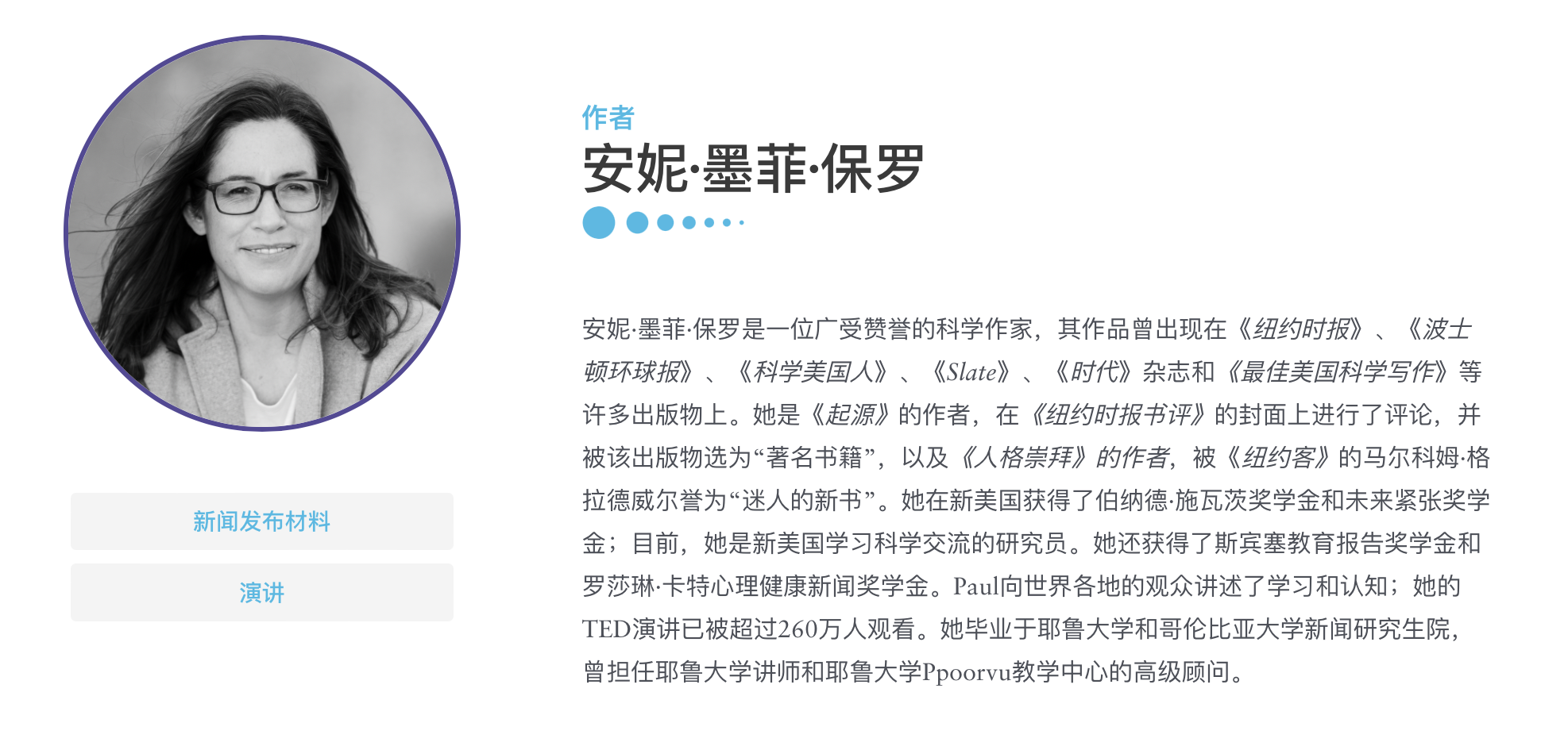作者:安妮·墨菲·保罗(Annie Murphy Paul)是一位知名的科学作家和记者,专注于心理学、认知科学和教育领域。她的作品广泛涉及如何通过科学方法提升人类的思维和学习能力。在心理学和认知科学研究领域有20多年的写作经验。安妮·墨菲·保罗拥有耶鲁大学的学士学位和哥伦比亚大学新闻学院的硕士学位。她的文章和作品经常出现在《纽约时报》、《时代周刊》、《科学美国人》等知名媒体上。