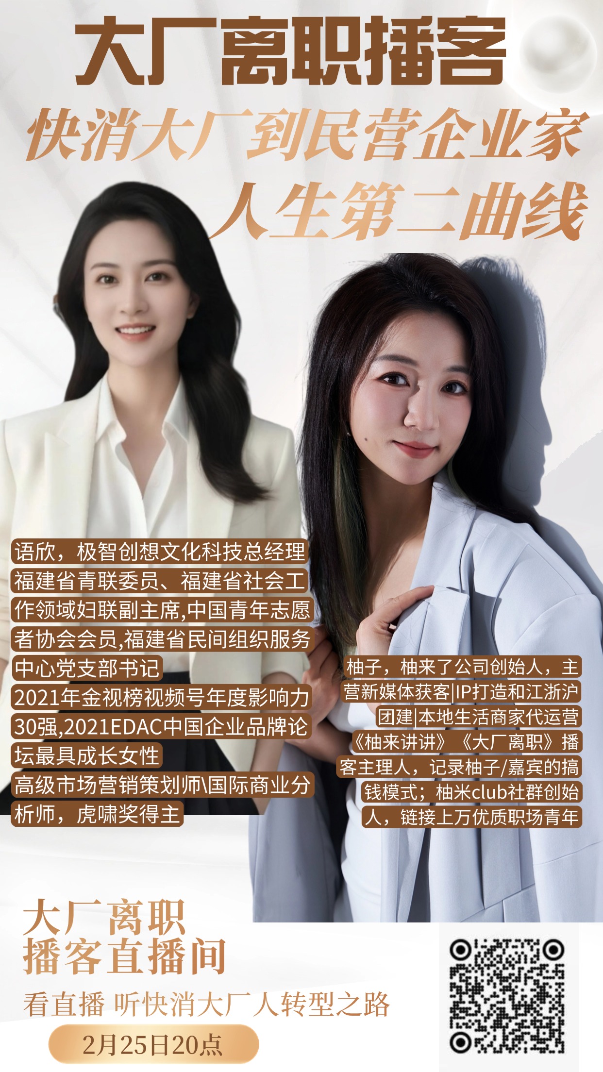 如果你对“大厂离职”播客感兴趣,或者想要了解更多关于嘉宾转型和职场规划及发展的信息,你可以通过以下方式快速链接到柚子: