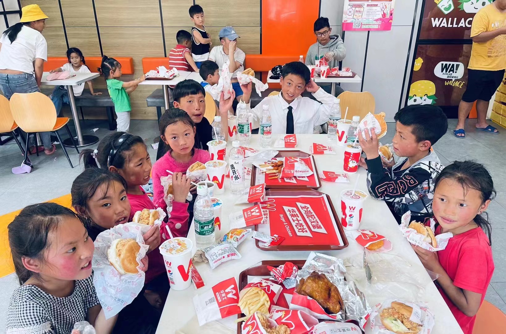 带孩子们吃汉堡薯条