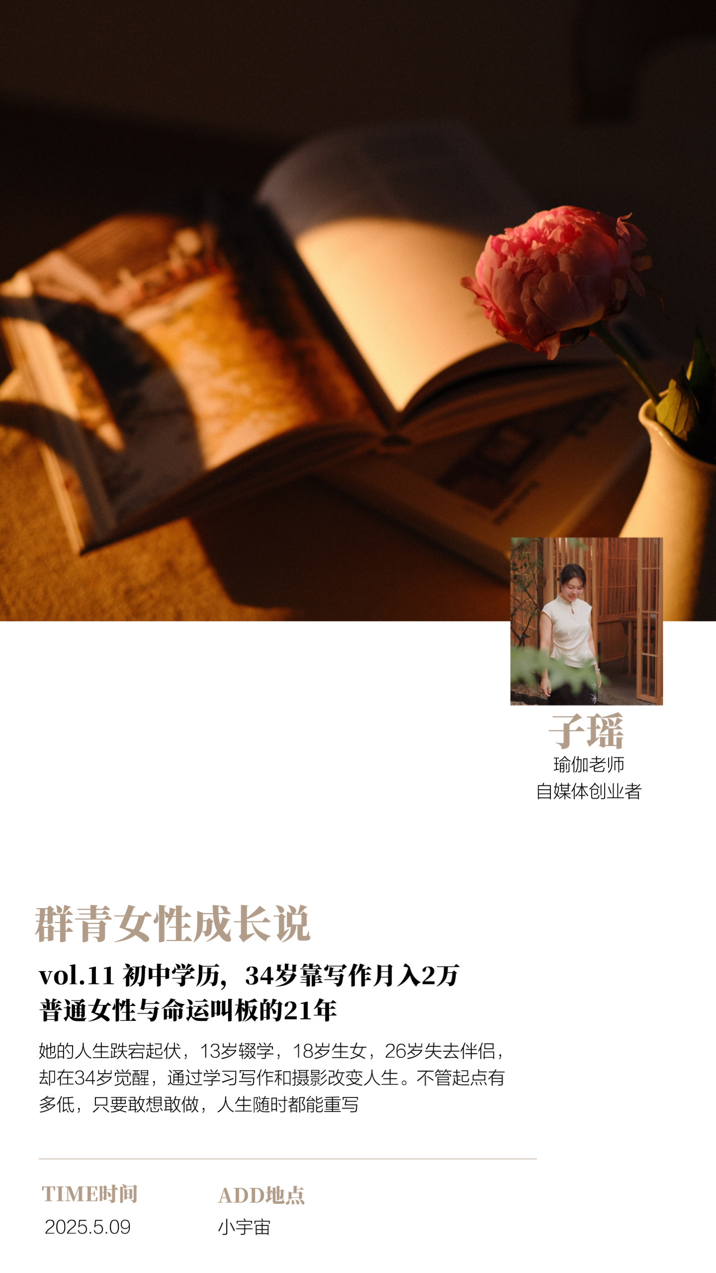 这期嘉宾是子瑶,一位从低学历、低起点逆袭的女性。她的人生可以说是跌宕起伏,13岁就辍学打工,18岁当了妈妈,26岁又失去伴侣。她没有被命运打趴下,在34岁这一年觉醒,通过学习写作和摄影改变人生。