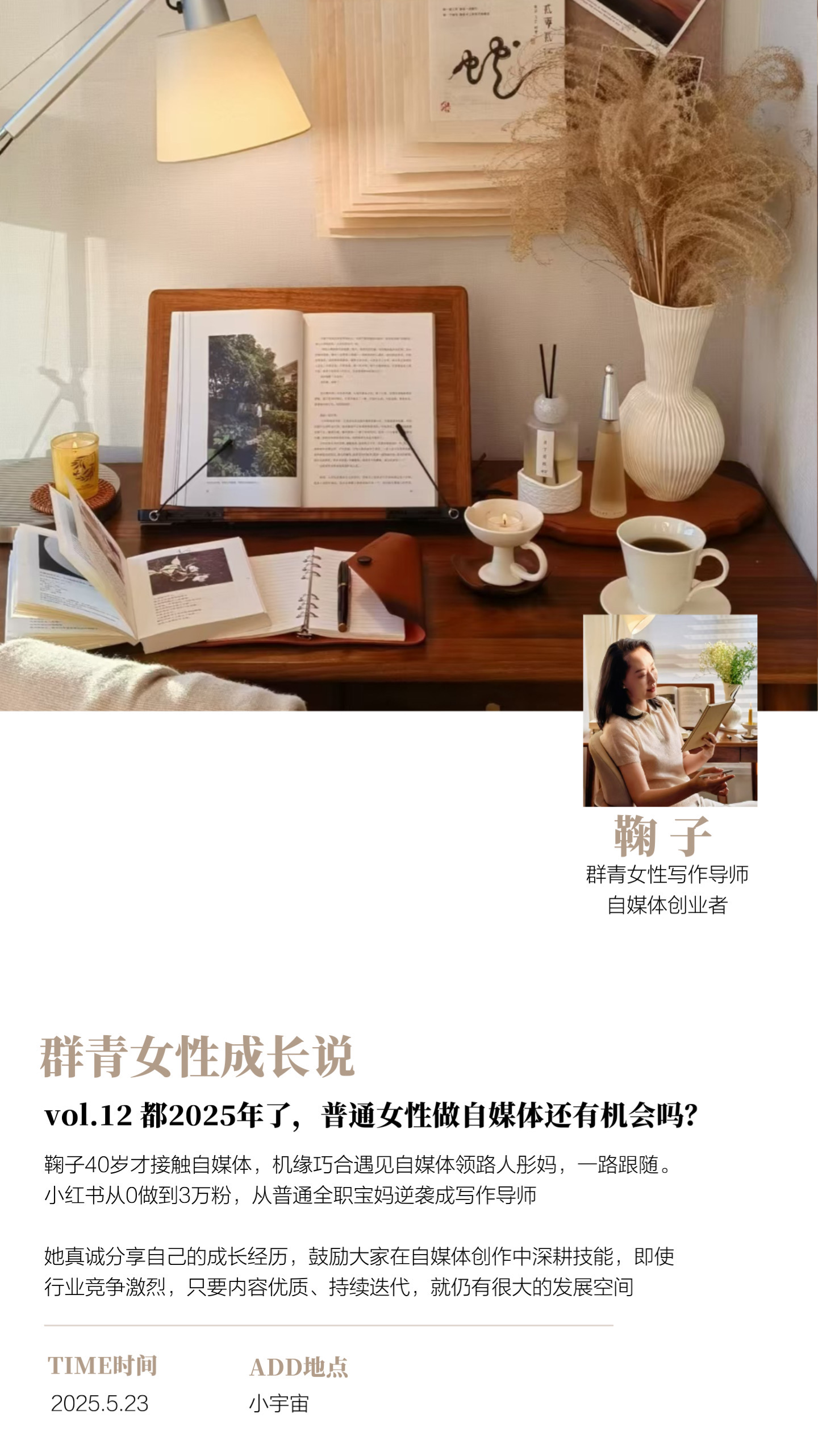 今天邀请群青女性成长学会写作导师鞠子,40岁开始做自媒体,小红书从0做到3万粉,从普通宝妈逆袭成写作导师。