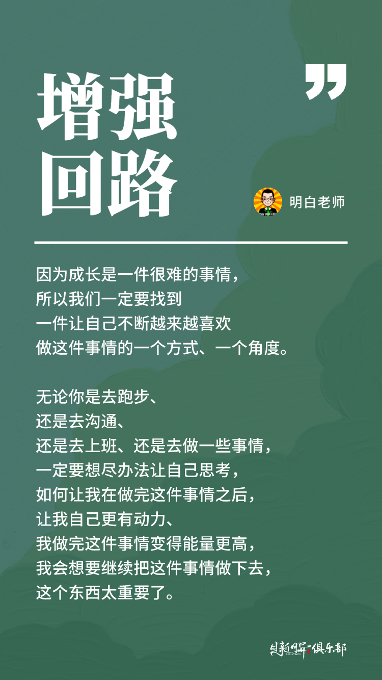 因为成长是一件很难的事情,所以我们一定要找到一件让自己不断越来越喜欢做这件事情的一个方式、一个角度。无论你是去跑步、还是去沟通、还是去上班、还是去做一些情,一定要想尽办法让自己思考,如何让我在做完这件事情之后,让我自己更有动力、我做完这件事情变得能量更高了,我会想要继续把这件事情做下去,这个东西太重要了。