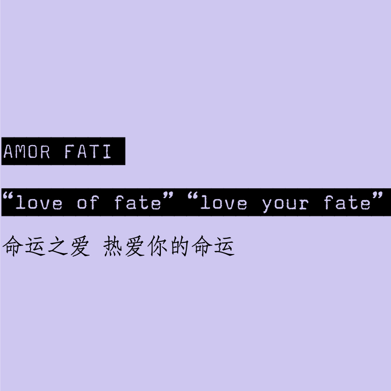 Amor Fati,是一句拉丁文谚语,尼采1882年把它作为新年愿望写给自己,它的英文意思是love of fate, or love someone’s fate,命运之爱,爱你的命运,我想尼采的愿望是接受一切命运赋予自己的,不用好或不好这样对立的眼光看待生活里发生的事情,爱你的命运,就是肯定生活里发生的一切,相信以及看见它们积极的一面。