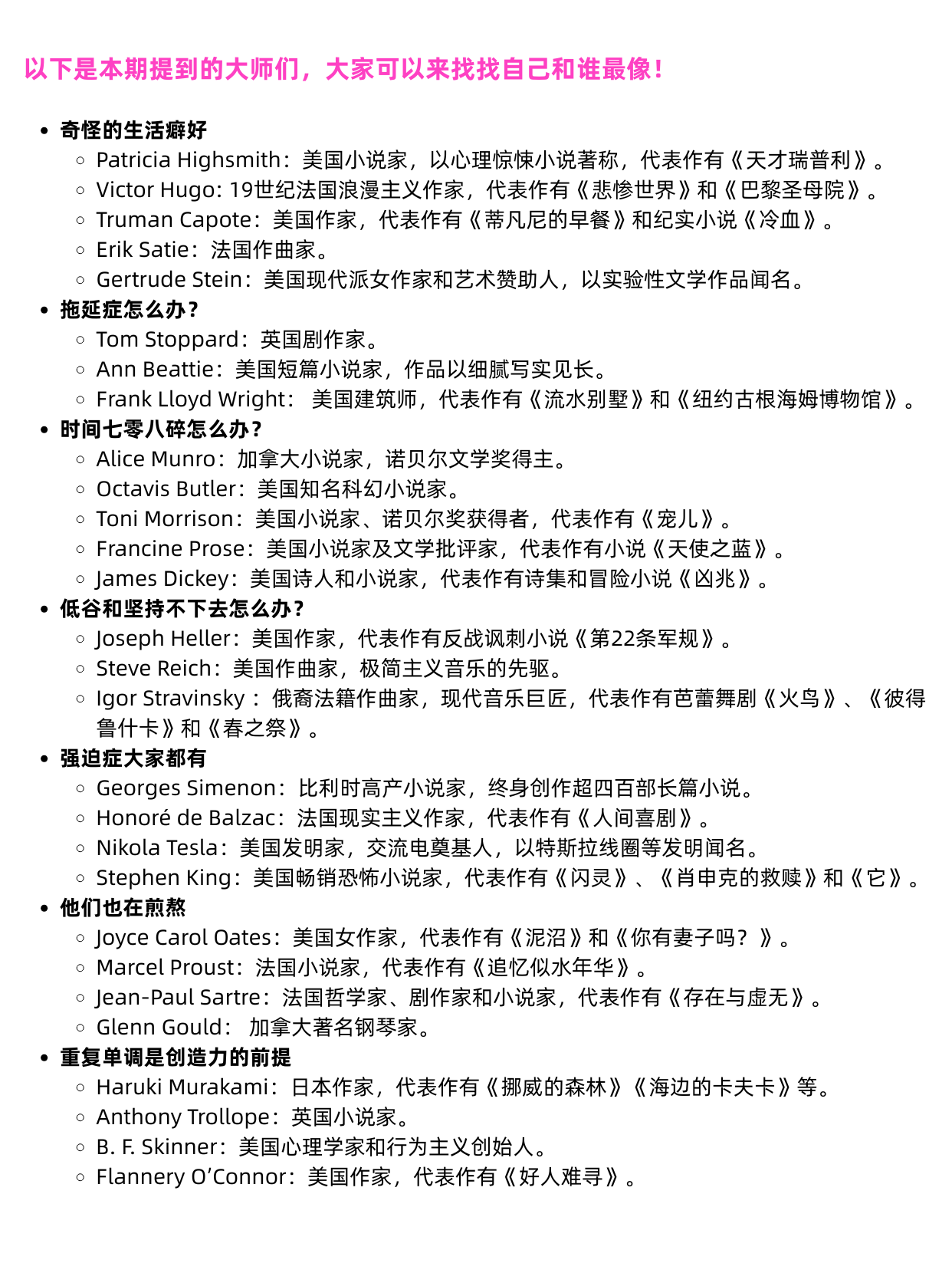 把咖啡当燃料,把散步当思考,把酒精当催化剂,那些困扰你的拖延症、强迫症、时间碎片化的挣扎、创作低谷的煎熬,大师们也曾深陷其中。但在这些琐碎与挣扎中,我们也发现了一些成就伟大的共性:早起工作、规律散步、固定社交,以及近乎偏执的单调重复。