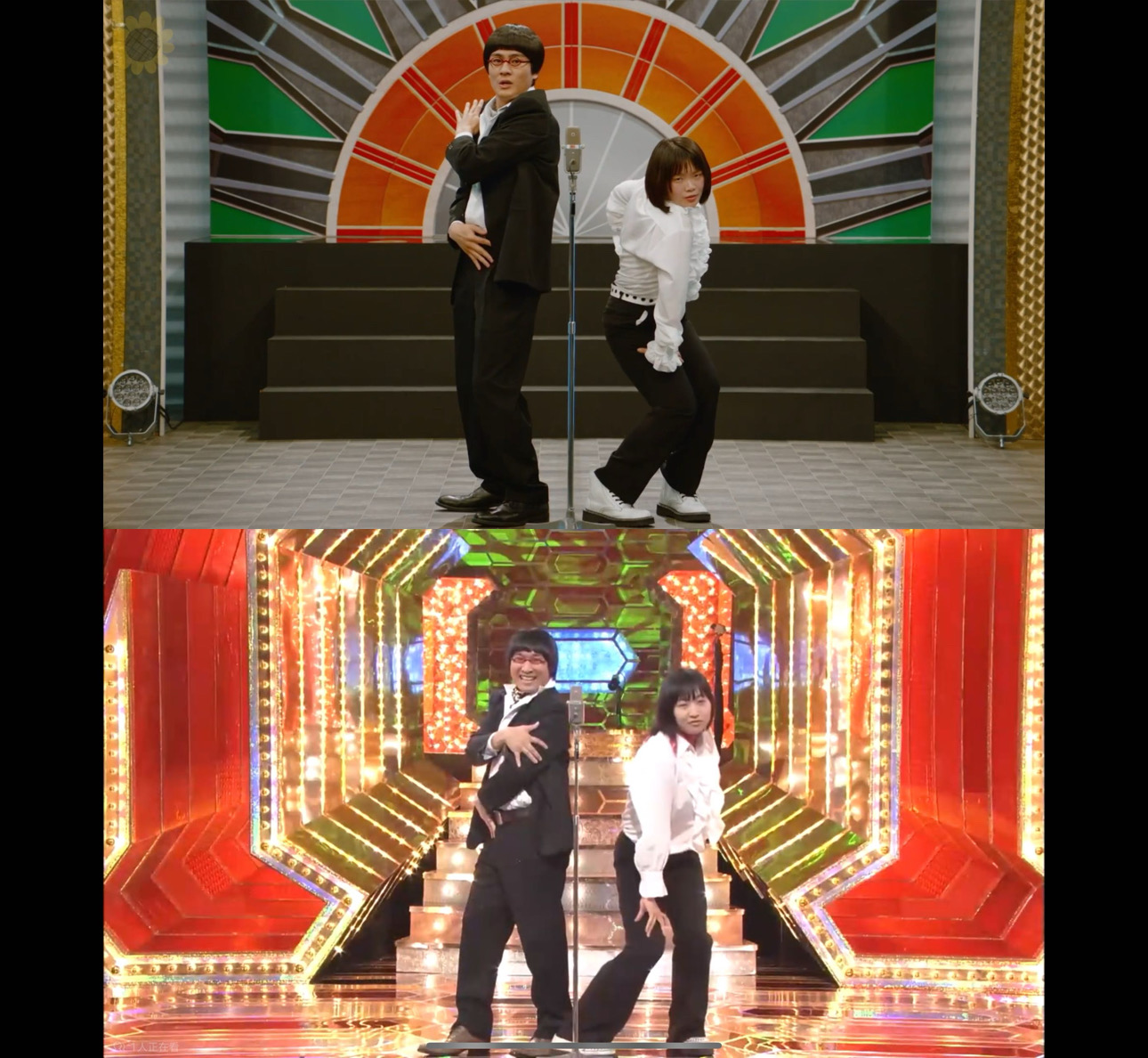 (上为剧里的”奥黛丽“,下是现实生活中的”奥黛丽“——左边是若林正恭、右边是春日俊彰)