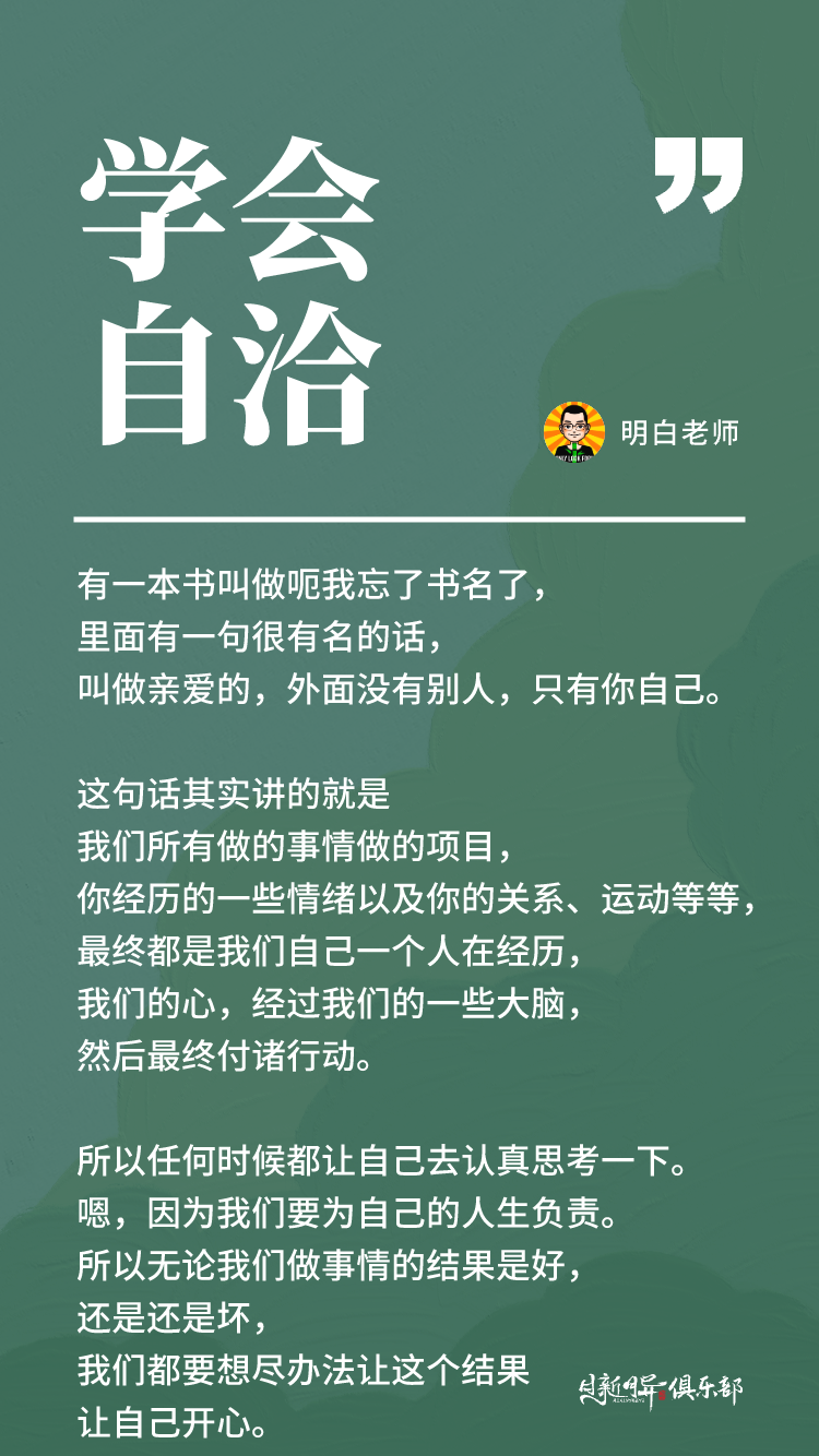 这是每个人我觉得最大的一个能力吧。这个能力有了,你做任何事情都会是开心的。然后当你开心了,你的思维会变得更强,也就能够更好的把事情做好,获得客观上的外部评价的结果。