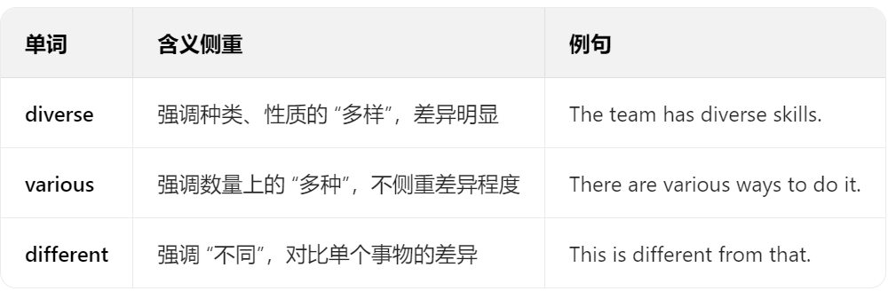 - 名词:diversity(多样性),如 cultural diversity(文化多样性)。