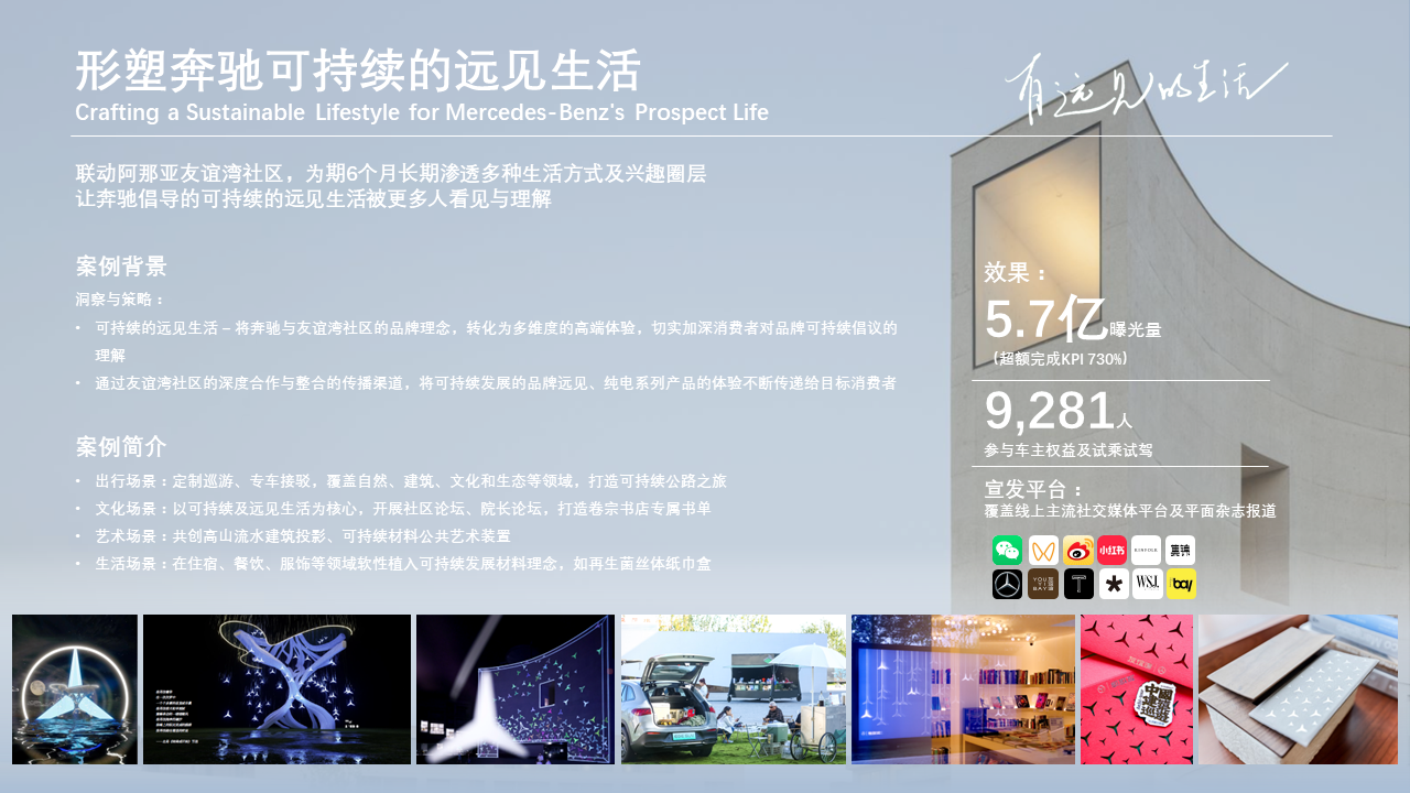 梅赛德斯-奔驰作为进口豪华汽车品牌,在新能源汽车市场竞争激烈的背景下,希望通过创造可持续的生活方式,增加目标群体对其电动车车型的好感。Wavemaker联动友谊湾,进行了一场为期6个月的长线及近距离全方位场景合作模式。他们将奔驰的可持续发展理念和纯电车型体验渗透到高端消费者的生活场景中,并通过高质量媒介创意内容输出及整合多元传播手段,达成了品牌商业目标。这一创新的营销模式不仅提升了奔驰品牌在目标人群中的影响力,还为进口豪华汽车品牌的电车市场提供了新的营销思路,成功引发了高端圈层的共鸣与讨论。