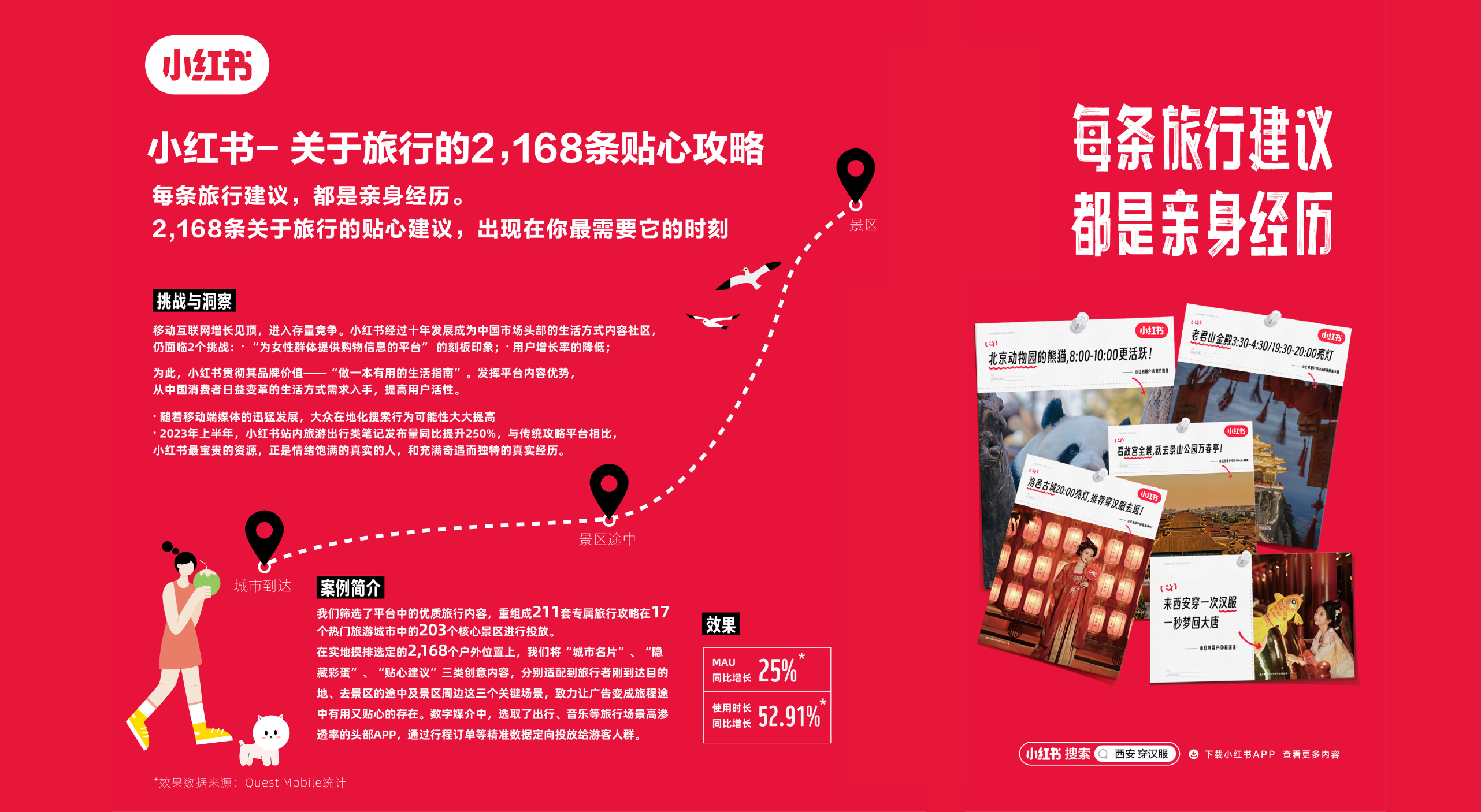 小红书作为头部生活方式内容社区,面对用户规模及活跃用户增长率降低的挑战,希望通过“近场”营销策略,提升用户在旅行场景中的活跃度。Wavemaker将旅行者从到达目的地城市到抵达景区门口的整个旅程高度覆盖,拆解分为三个场景:目的地到达、目的地景区途中、景区到达。他们针对旅行者在这三个场景中不同的出行习惯,选择了大众交通媒介及热门商圈LED广告牌进行投放,力求广告内容能够切实解决旅行者当时当下的问题。这一创新的营销策略不仅提升了小红书在用户旅行场景的心智,还提高了用户活跃度,使用时长同比增长52.91%,为小红书平台的增长提供了新的动力。