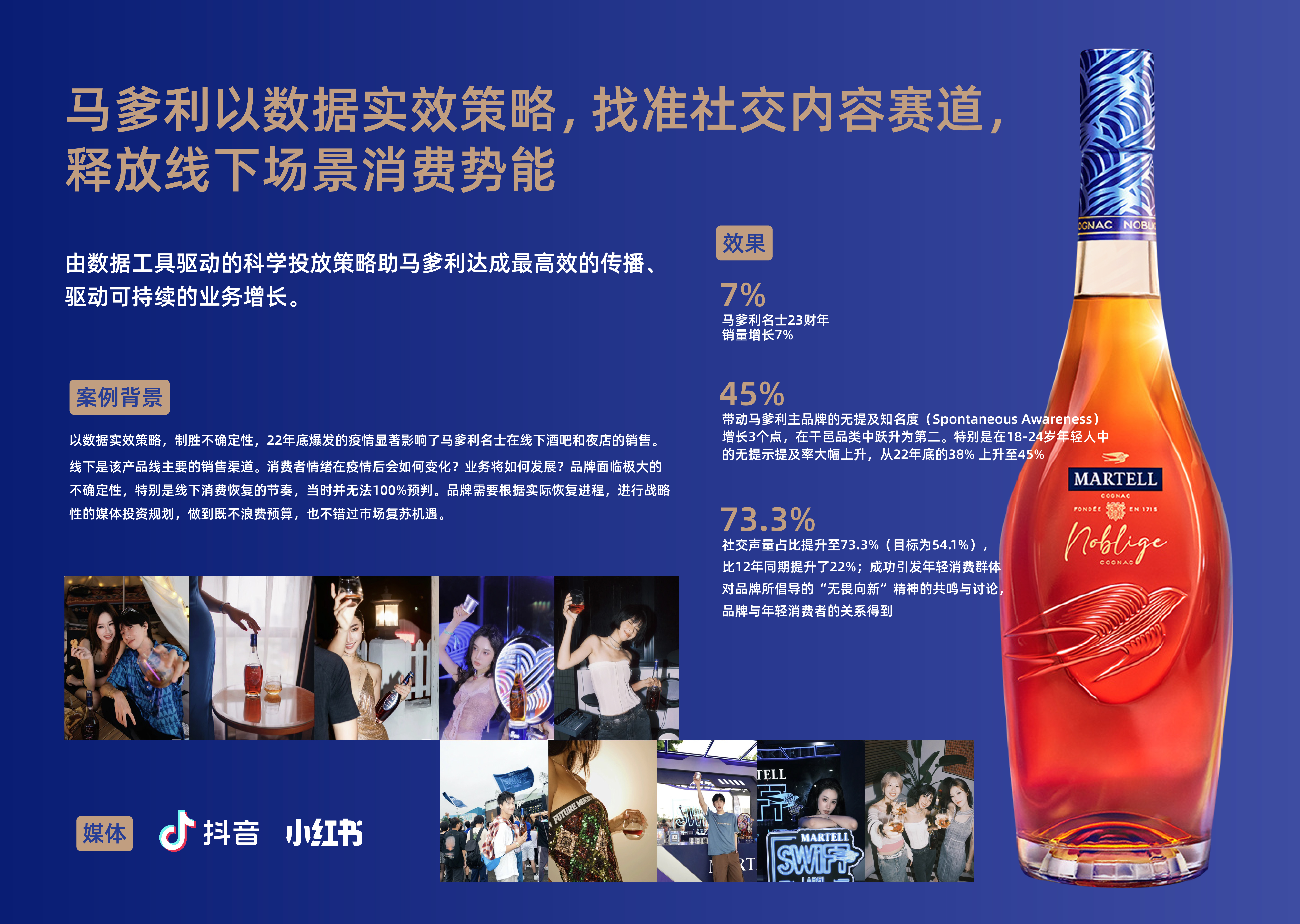 马爹利名士在后疫情时代面临线下销售渠道恢复节奏的不确定性,尤其是其主要消费场景——酒吧和夜店的复苏难以预判。Wavemaker通过实时效果分析系统,结合销售数据,为马爹利制定了抖音与小红书双平台结合的社会化营销策略。他们深入分析马爹利名士的消费人群在两个平台上的差异化内容偏好,进行精准的内容细分和人群圈选,实现了高效触达和精准沟通。这一策略不仅帮助马爹利在年轻消费群体中提升了知名度,还促进了品牌的生意增长,实现了品牌主品牌无提及知名度增长3%,18-24岁年轻人中的无提示提及率从38%上升至45%的显著效果。