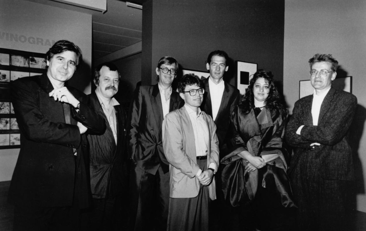 1988 年纽约现代艺术博物馆(MoMA)解构主义建筑展览中的建筑师。从左至右:伯纳德·屈米、赫尔穆特·斯威茨尼茨基、沃尔夫·D·普莱斯、丹尼尔·里伯斯金德、雷姆·库哈斯、扎哈·哈迪德,以及策展人马克·维格利。