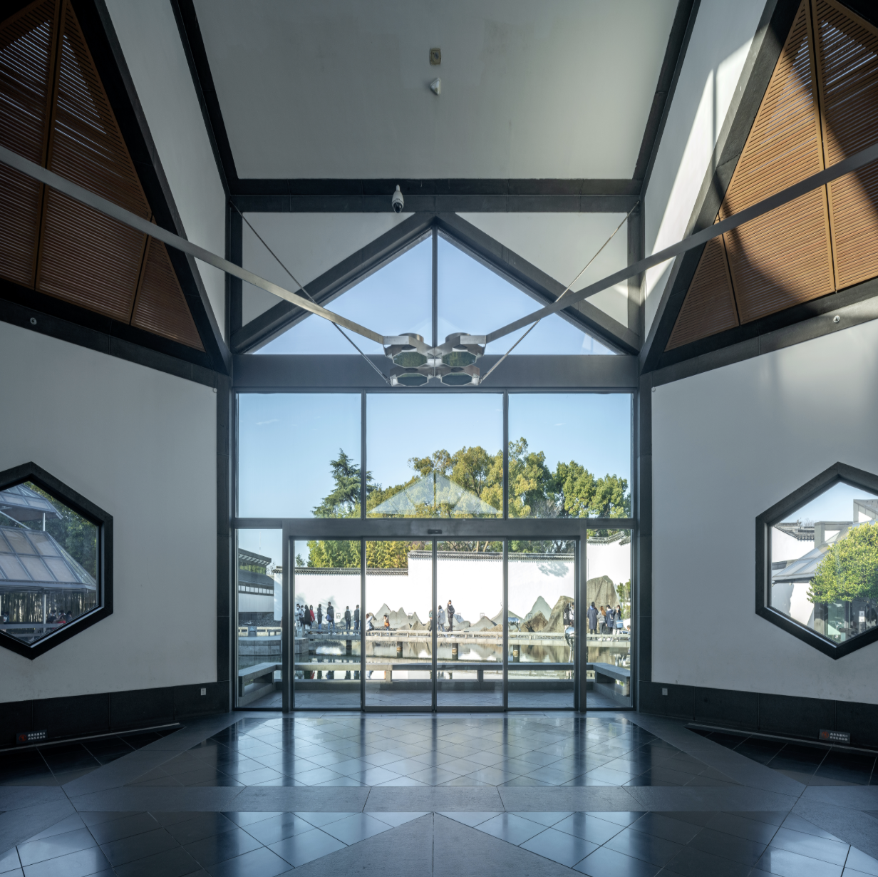 苏州博物馆(2000–2006)大厅框起了花园中的石景等主要景观,苏州,2021 年。摄影:田方方。M+ 委约拍摄,2021 年。© 田方方