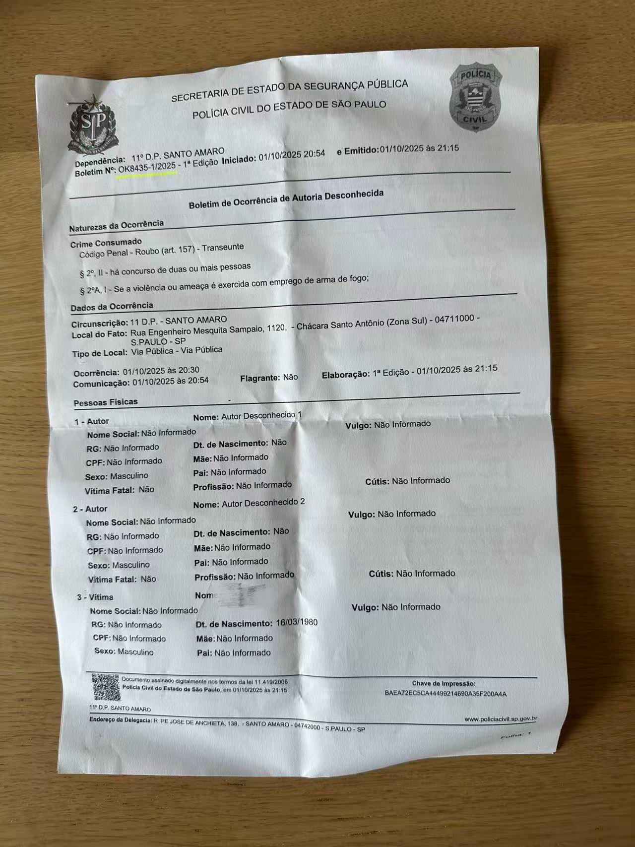 10月1日凌晨,在巴西圣保罗出差的 George 遭遇了人生中一次真正的“惊魂夜”。准备打车去机场的他,被持枪歹徒抢走行李。直到通过安检时才发现,对方当时射出的竟是真的子弹——而他的笔记本电脑,正好卡住了子弹。回国途中,George 在小红书上写下这段经历,提醒大家出国在外要时刻警觉。这篇帖子意外走红,《新京报》、腾讯新闻也相继报道。