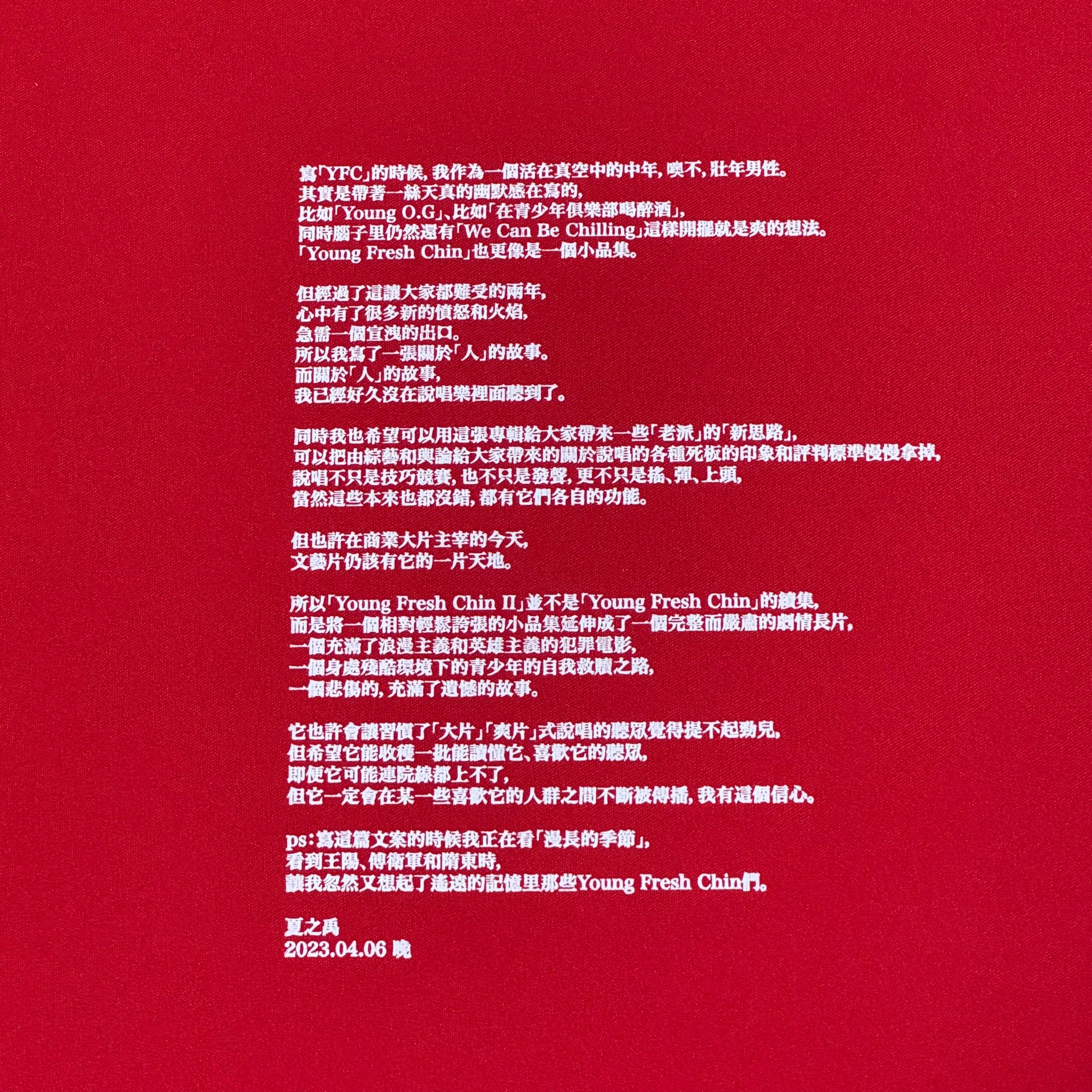 《Young Fresh Chin II》是夏之禹于2023年发行的专辑,这张专辑是夏之禹“不存在的电影系列”第三部作品,也是“年轻的下巴颏子”系列第二部作品。专辑以一个21岁主人公的视角,讲述了一个西南小镇棚屋区厂工子弟的成长与救赎之路。夏之禹将自己成长于川渝小镇的经历融入其中,通过音乐传递出对社会现状的愤怒和不满。