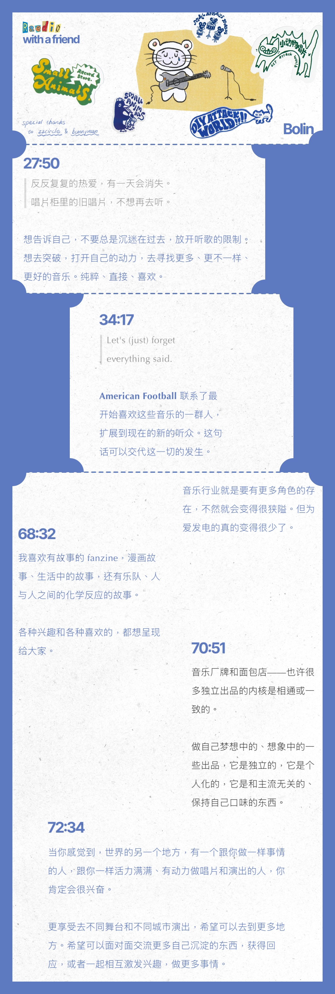 准备和制作了非常久——邀请bolin(小动物唱片/鼠鼠鼠/棉花山脉)聊了3小时的天,这些片段成为这80分钟。