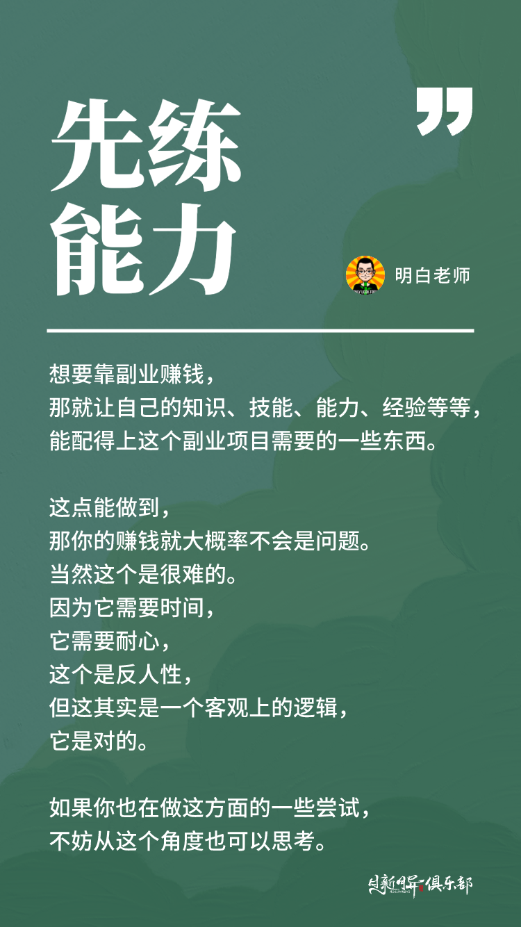 想要靠副业赚钱,那就让自己的知识、技能、能力、经验等等,能配得上这个副业项目需要的一些东西。这点能做到,那你的赚钱就大概率不会是问题。当然这个是很难的,因为它需要时间,它需要耐心,这个是反人性,但这其实是一个客观上的逻辑,它是对的。如果你也在做这方面的一些尝试,不妨从这个角度也可以思考。