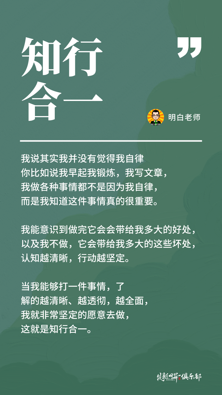 当我能够打一件事情,了解的越清晰、越透彻,越全面,我就非常坚定的愿意去做,这就是知行合一。什么叫知行合一,知就是知道,行就是行动,知道了,就一定能够做到。如果发现做不到,那一定就是不知道。
