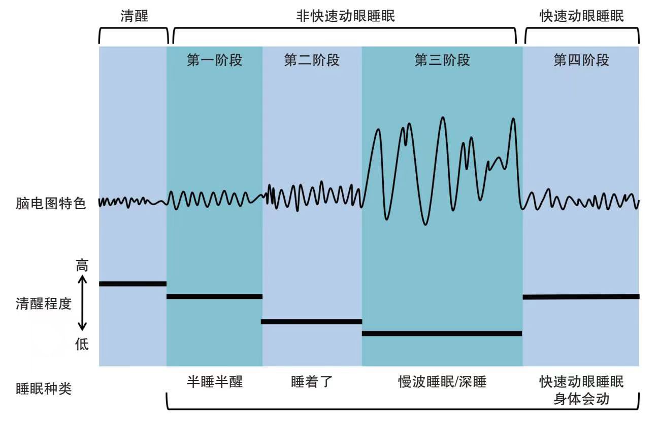 在一晚上的睡眠过程中,我们大约会经历4-5个睡眠周期的循环,每个循环大约持续为1.5-2小时。在每个循环中,根据眼球运动和脑波的特色,可以分为快速眼动睡眠和非快速眼动睡眠;其中非快速眼动睡眠可以分为半梦半醒、浅睡眠和深睡眠三个阶段。在每个循环中,我们会从清醒状态逐步一层一层的深入,进入到深睡眠的状态,然后又从深睡眠的状态一层一层变浅,进入快速眼动睡眠,然后又进入下一个循环: