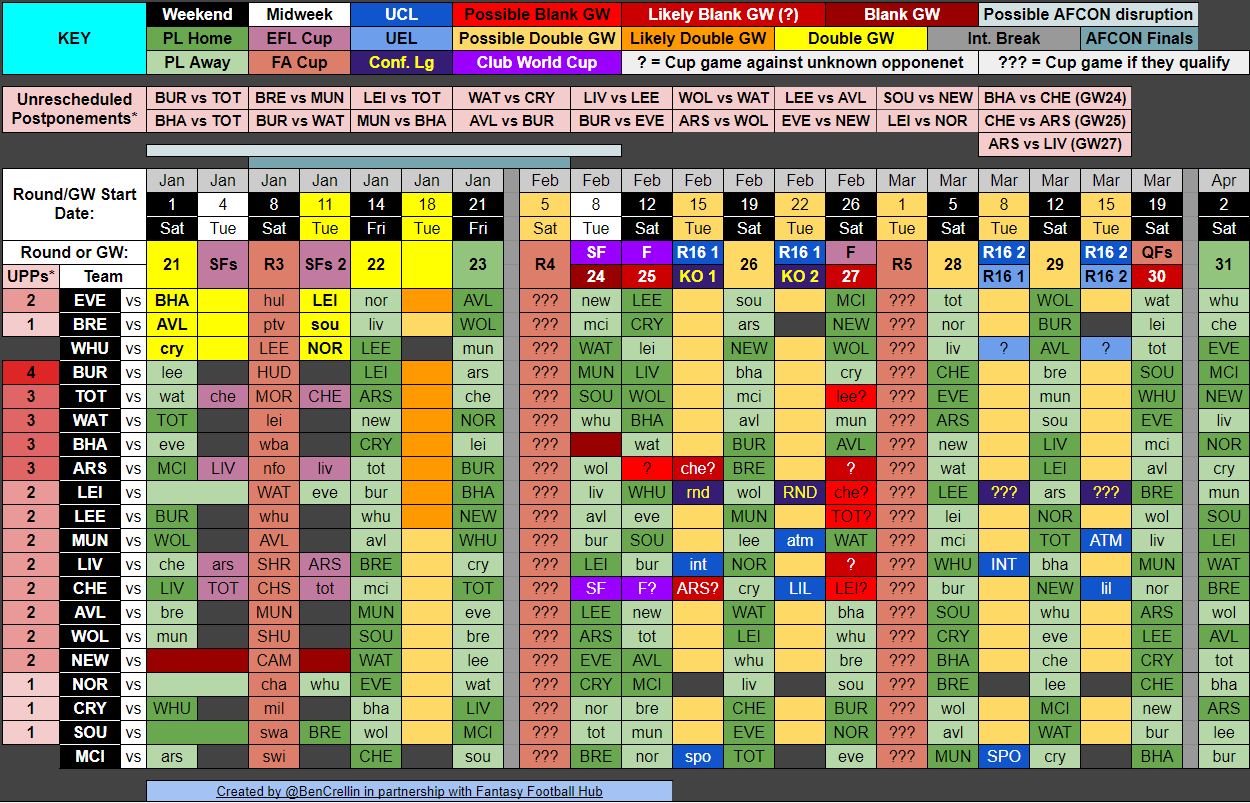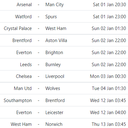 GW21赛程已经确定更新,西汉姆联、埃弗顿、布伦特福德都是双赛,纽卡斯尔联和南安普顿的比赛推迟,赛程如下: