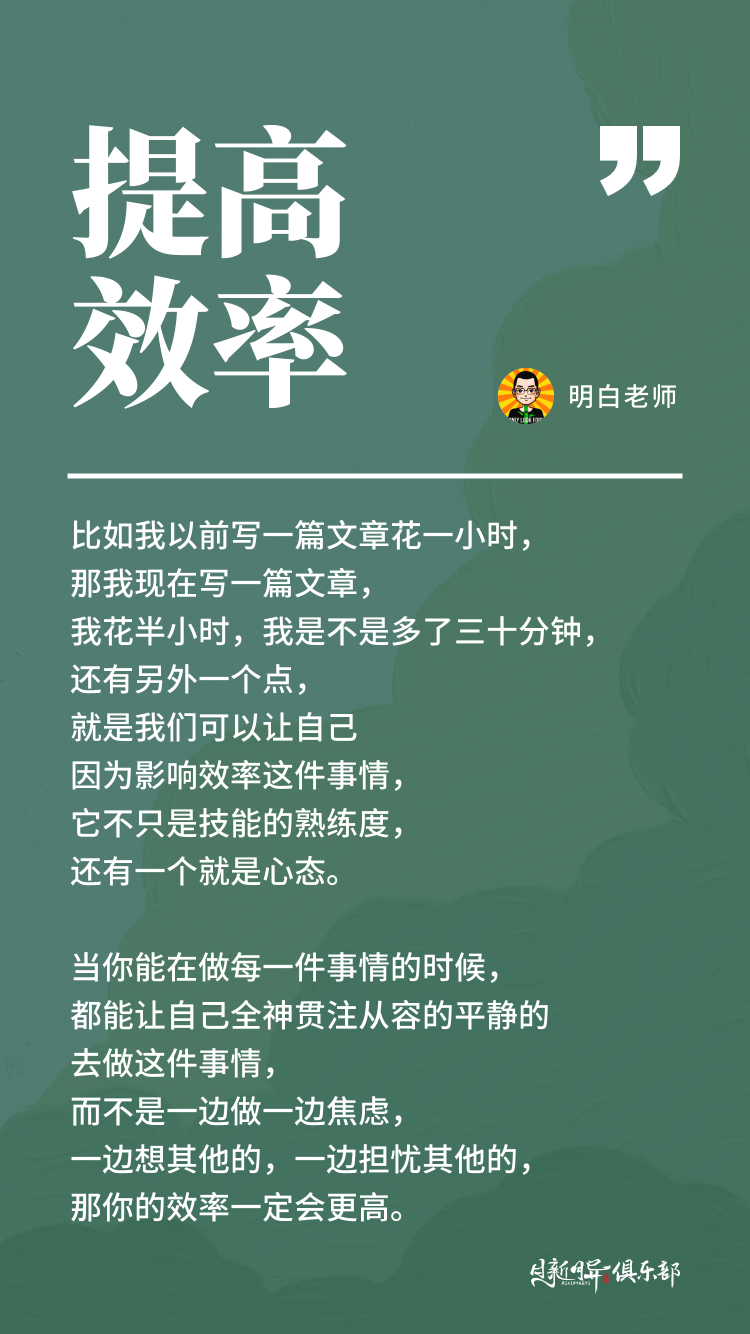 比如我以前写一篇文章花一小时,那我现在写一篇文章,我花半小时,我是不是多了三十分钟,还有另外一个点,就是我们可以让自己因为影响效率这件事情,它不只是技能的熟练度,还有一个就是心态。