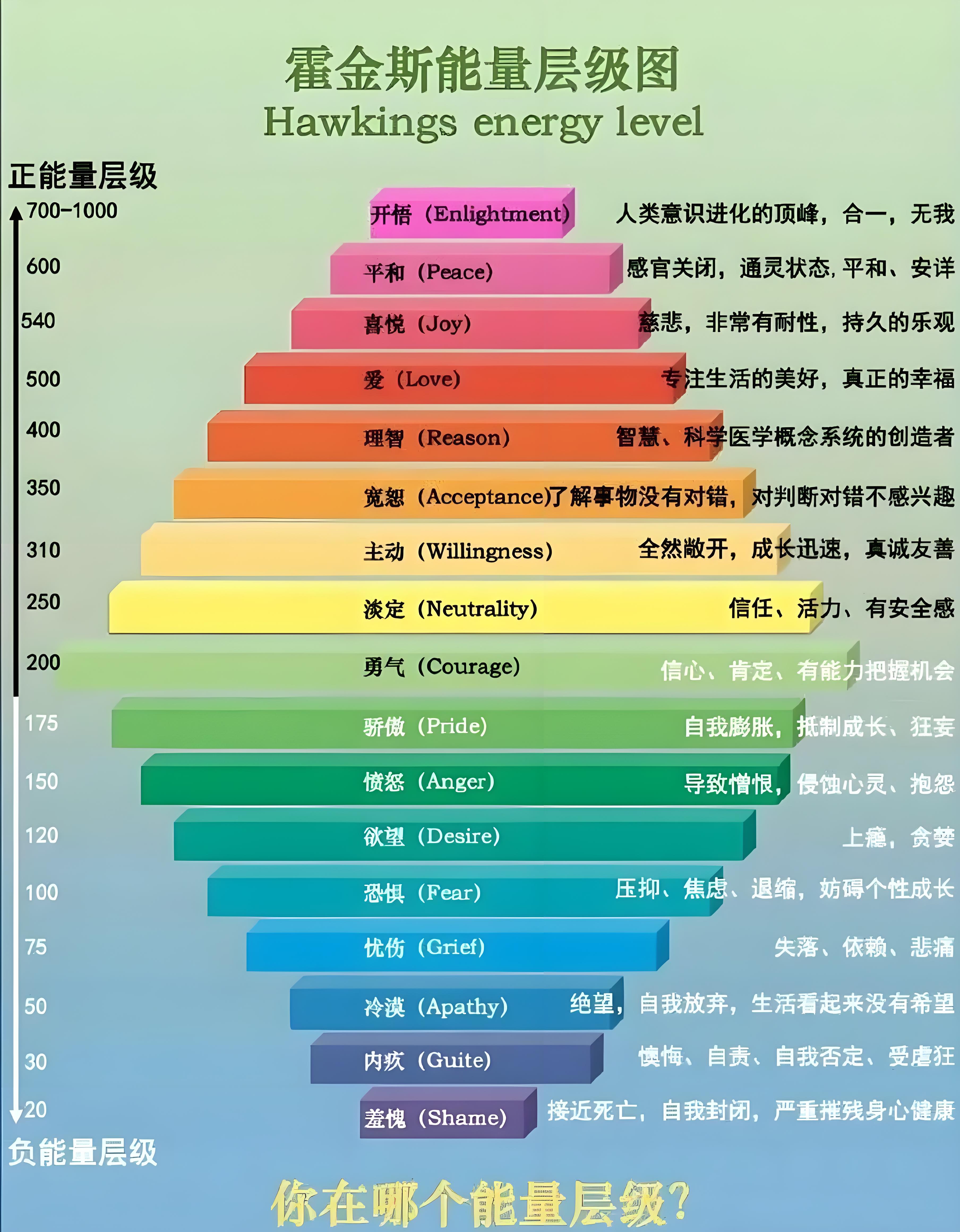 本期节目的内容非常饱满,知识密度很高,其实也可能得益于两个ENTJ的认知交流。车车在节目开端就表达了自己对于当下人生状态的描述,她觉得自己此刻正在经历了享受一种平和的人生状态。这个描述让我非常吃惊,原因在于“平和”的状态是一种很高级的能量级别。于是我便找出了我最近刚刚看过的一张关于能量层级的图表,也分享给听友们,大家可以自测一下自己在哪个能量层级。