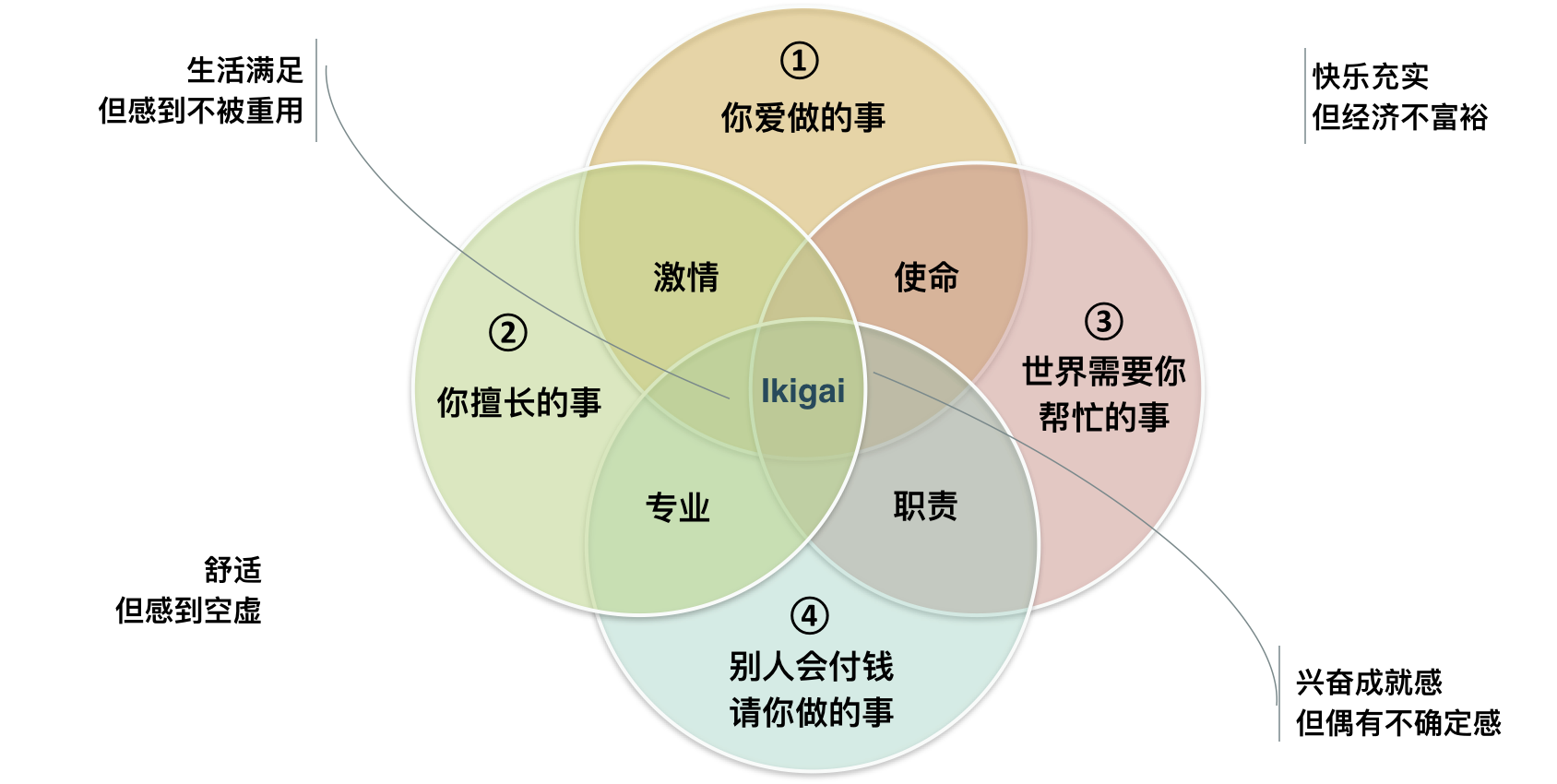 你也许看到过以下这个叫做“人生的意义”的IKIGAI的模型,你爱做的事/你擅长做的事/世界需要你帮忙的事/别人会付钱请你做的事,它们彼此交集,带来Sweet point的甜蜜心流。那么,怎么可能这四个象限终其一生都不变的呢?如同乔伊说的:生命啊,是一种平衡啊。那就快乐地去—-顺—-变—-吧