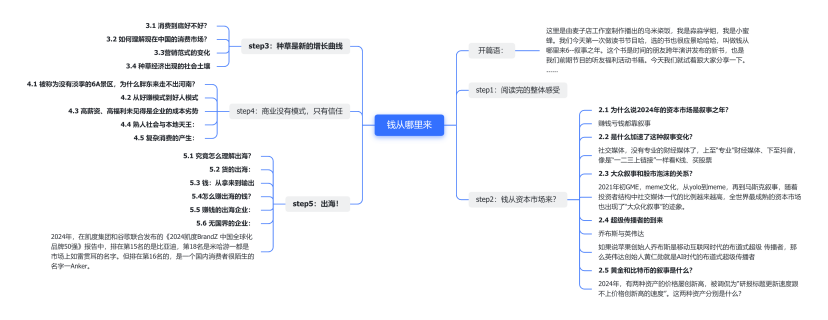 本期是一期读书节目,是在时间的朋友跨年演讲时发布的新书--《钱从哪里来》。这是该系列的第6本,今年的主题是“叙事之年”。内容很通俗易懂,回顾2024年全年的投资、商业现象,从资本市场9.24政策影响、小红书种草经济、胖东来熟人经济,到全年大火的“出海”热潮。