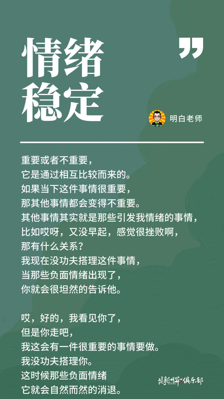 如果当下这件事情很重要,那其他事情都会变得不重要。其他事情其实就是那些引发我情绪的事情,比如哎呀,又没早起,感觉很挫败啊,那有什么关系?我现在没功夫搭理这件事情,当那些负面情绪出现了,你就会很坦然的告诉他。